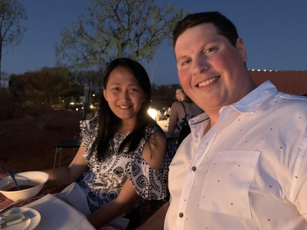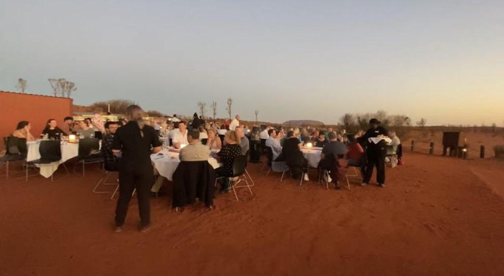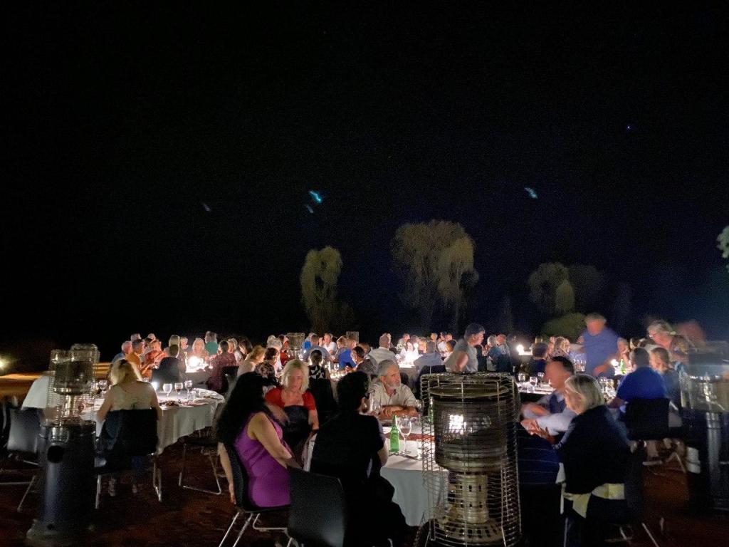 Setelah hari mulai gelap, kita diarahkan ke tempat duduk kita untuk makan malam. Kita akan bergabung dengan 8 wisatan yang lain dalam satu meja, seru juga sehingga kita bisa saling kenal satu dengan yang lain. Kita berkenalan dengan dua pasangan suami istri dari Sydney dan Adelaide, juga ada dua jurnalis. Sepanjang makan malam kita saling bercerita tentang pengalaman berpetualang masing-masing.
