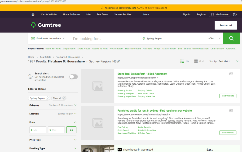 Website ini salah satu yang sangat banyak orang gunakan karena kalian bisa cari apa saja disini seperti cari kerja, cari furniture bekas, cari akomodasi, dan lainnya. Untuk Gumtree ini sendiri, kalian harus lebih berhati-hati karena siapa saja bisa posting iklan apartemen atau ruangan yang disewakan di sini karena gratis. Jadi pastikan kalian mendapatkan semua informasi yang kalian butuhkan termasuk inspeksi tempat, profile tentang orang yang tinggal disana, dll sebelum kalian memilih akomodasi tersebut.