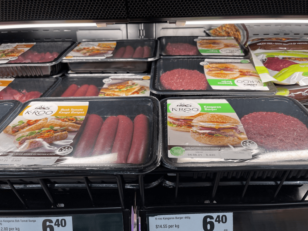 - Daging Kangguru. Kangguru merupakan hewan nasional Australia yang dikarenakan populasinya yang banyak dan untuk mengendalikan pertumbuhan populasi kangguru sejak tahun 2002 hewan ini diizinkan untuk diburu. Dengan demikian kalian akan sering melihat daging kangguru ini dijual di supermarket, pasar, dan bahkan di export ke luar negeri khususnya Jerman, Prancis, dan Inggris. Kangguru merupakan sumber protein utama suku Aborigin Australia. Dagingnya memiliki kandungan protein yang tinggi dan kadar lemak yang rendah sehingga bermanfaat untuk mencegah obesitas dan anti diabetes. Selain di supermarket, beberapa restoran juga menghidangkan menu daging kangguru ini. Potongan daging yang sering dijual berupa steak, sosis, daging cincang, dan fillet.