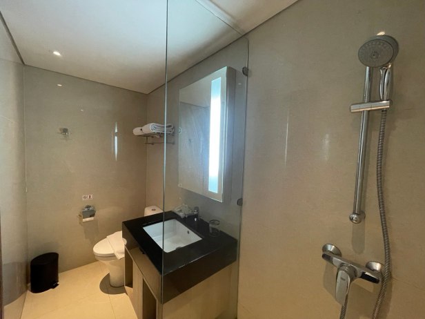 Setelah pada akhirnya kita bisa check-in, kita dapat kamar di lantai 18 dari total 24 lantai. Tempat parkirnya cukup luas berada di lantai 1-5. Untuk naik ke kamar menggunakan lift, kita cukup menunggu lama untuk bisa ke atas, karena memang lift nya hanya dua, space lift nya juga tidak luas dan saat itu akhir pekan jadi agak ramai. Bukan hanya saat itu, setiap kali kita nunggu lift untuk mobilisasi dari lobby, lantai kamar, tempat parkir, ke lantai 24 (untuk ke fasilitas kolam renang dan gym) dan ke restoran untuk sarapan di lantai 6, kita cukup nunggu agak lama dan antri juga sama tamu hotel yang lain. Berhubung kita bawa kendaraan, kita juga daftarkan plat nomor mobil di resepsionis saat check in supaya dapat parkir gratis.