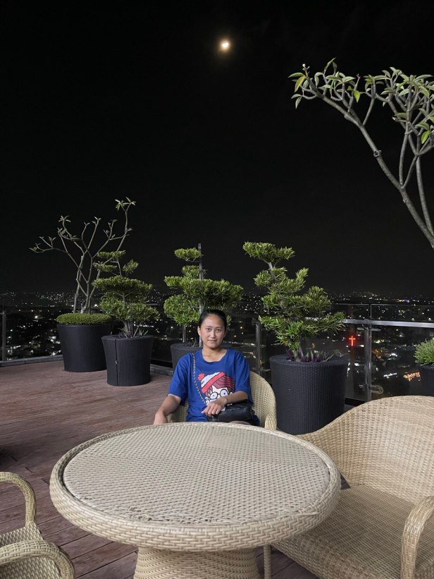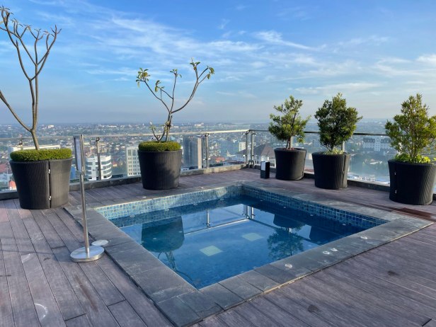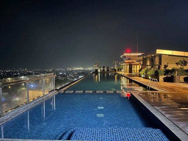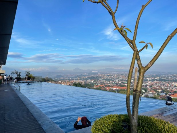 Karena kita agak bosan di kamar, karena channel TV nya juga yang terbatas jadi kita ke lantai 24 di area kolam renang (infinity), kolam renang anak, jacuzzi dan gym. Ini area favorit kita kalau lagi nyantai, bisa menikmati kota semarang dari ketinggian dan kita juga bisa lihat Lawang Sewu malam hari dari sini. Terdapat banyak pilihan untuk tempat duduk juga untuk bersantai. Sayangnya saat itu whirlpool / jacuzzi nya lagi maintenance, kalau tidak kita sudah berendam. Bayangin aja aku jadi pengen. Kolam renangnya cukup luas dan ukuran yang memanjang dan ada juga area kolam untuk anak-anak. Dari lantai ini kita menyadari betapa indahnya kota Semarang yang dapat terlihat beberapa gunung seperti gunung Ungaran, gunung kembar, bahkan gunung Merapi Semeru kalau tidak berkabut.