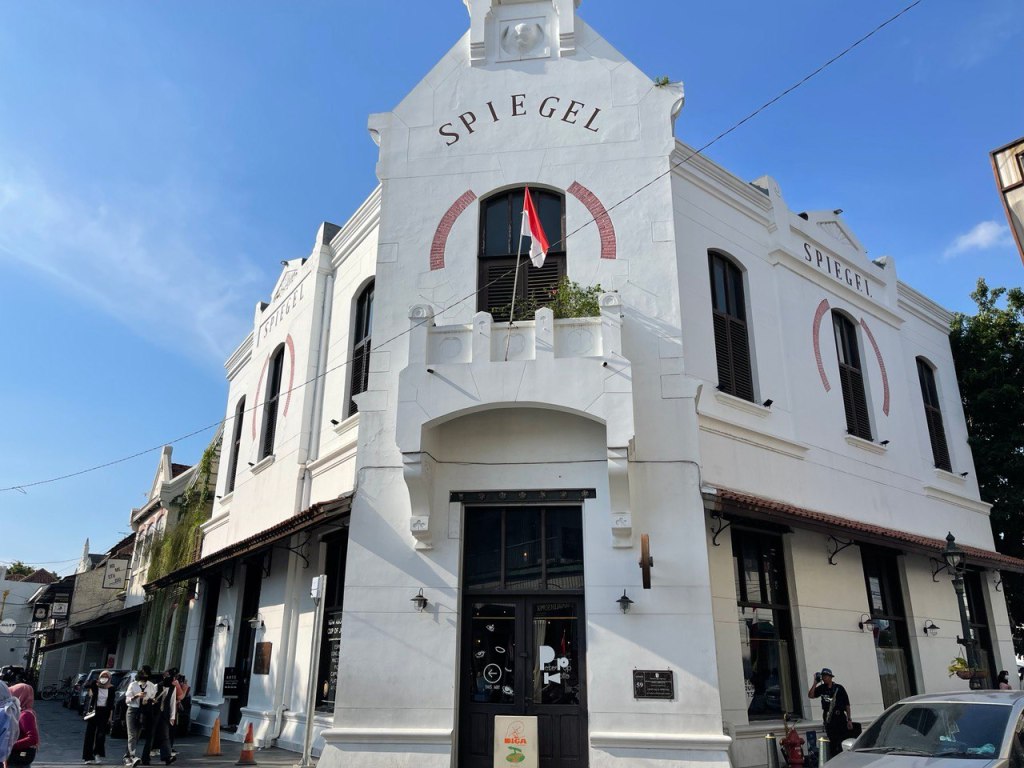 Setelah itu mata kita mulai melirik ke Gedung Spiegel yang merupakan Bar dan Bistro. Suasanya didalam bistro ini seperti kembali ke zaman dulu dengan gaya restoran klasik eropa. Arsitektur bangunan ini menggunakan lapisan batu bata, langit-langit yang tinggi, jendela yang melengkung, dan terdapat beberapa jendela yang besar pada setiap sisi. Makanan yang ditawarkan juga bervariasi dari makanan lokal Indonesia, western, maupun Chinese food. Bistro ini buka setiap hari dari jam 10 pagi sampai tengah malam. Selain tempat nongkrong, tempat ini juga dilengkapi dengan area meeting, cooking & coffee brewing workshop, dan berbagai pilihat paket event (seperti, ulang tahun, pre-wedding, perayaan avnniversarry, dsb). Awalnya tempat ini dibangun pada tahun 1895 oleh perusahaan NV Winkel Maatschappij sebagai pusat toko serba ada pada zaman itu. Kemudian dilakukan perbaikan oleh pemerintah kota Semarang pada tahun 2019.