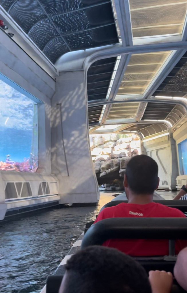Makan siang di Jurassic cafe. Harga makanan disini mahal bingits, tapi porsinya juga besar jadi kita makan satu porsi berdua turkey leg and chips (U$ 17.51 atau 275k Rupiah). Minumnya gratis, botol air minum kita tinggal diisi ulang saja disini (lumayan menghemat). Rame banget orang di jam makan siang, harus ngantri 10 menit sebelum bisa pesan. Karena kita makan kayak di food court gitu, aturan tak tertulis di Amerika, setelah makan sampah/ sisa makanan kita harus buang sendiri.