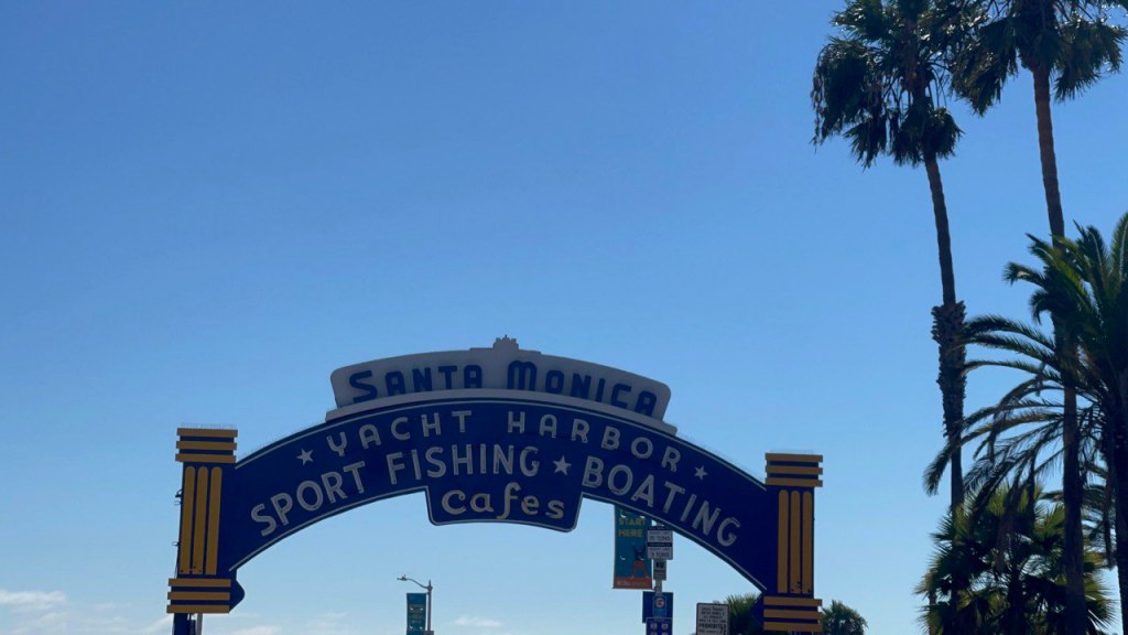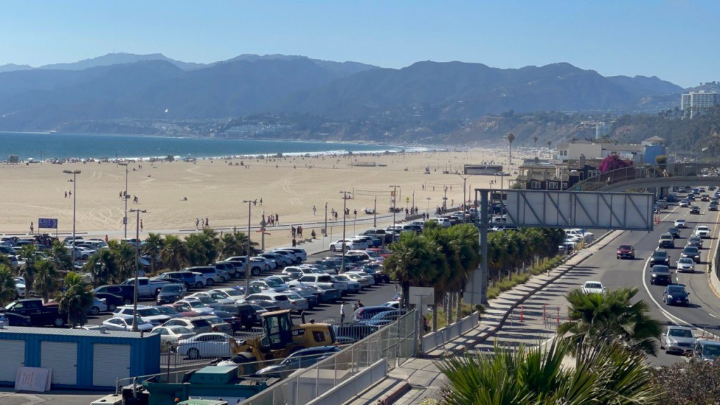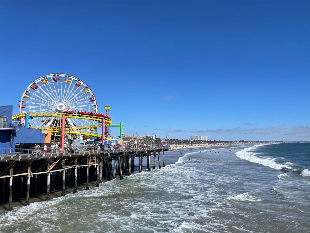 Dari downtown LA tepatnya di 7th Street (Metro Center), kita naik light rail (E line, Expo) ke sebelah barat LA yaitu downtown Santa Monica dengan menempuh perjalanan sekitar 40 menit. Setelah itu kita lanjut jalan kaki ke pantainya. Banyak banget orang disini, bahkan di pantainya lebih banyak lagi. Tidak jauh jalan, kita tiba juga di dermaganya yang paling terkenal sebagai ikon pantai California selatan. Dermaga kayu ini sangat besar dengan panjang sekitar 5.6km dan ada 3 tingkat. Disini ada banyak orang mancing, tempat makan, toko souvenir, dan bahkan ada taman hiburan namanya ‘Pacific Fair’ (ada bianglala, roller coaster dll). Suami senang banget kesini, karena langsung teringat sama permainan favoritnya GTA . Bahkan langsung bisa nemu WC di dermaga ini karena posisinya yang sama persis dengan yang ada di game ini.