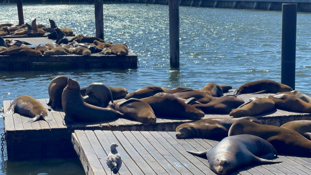 Dari sini kita naik bus ke Fisherman Wharf, tempat pemberhentiannya berada tepat disamping toko sovenir Golden Gate Bridge. Area pelabuhan ini awalnya didiami oleh komunitas nelayan generasi awal imigran Italia di awal tahun 1800san. Keluarga imigran ini memiliki perahu nelayan yang berlayar mencari dan membawa pulang berbagai tangkapan laut untuk dimakan dan dijual dirumahnya. Sekarang area ini sangat berkembang dan bahkan menjadi salah-satu spot favorit turis. Disini kalian akan menemukan banyak restoran yang menjual makanan laut segar, alun-alun Ghirardelli, pusat perbelanjaan, museum lilin, museum Maritim, dll. Selain itu dari sini juga kalian bisa melihat jembatan Golden bridge dan Alcatraz. Spot yang paling terkenal turis berada di Pier 39 khususnya di dock K. Disini kalian bisa melihat banyak banget sea-lions atau anjing laut yang lagi beristirahat sambil berjemur. Baru kali lihat anjing laut di alam bebas sedekat dan sebanyak.