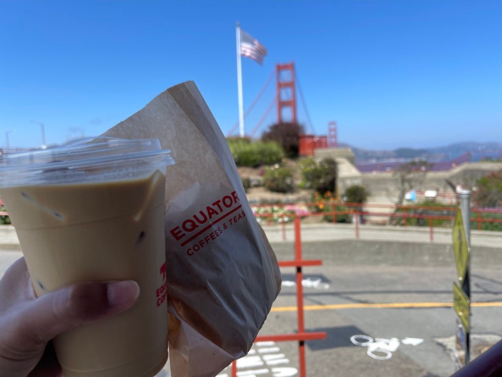 Katanya Jembatan Golden Gate ini merupakan jembatan terindah dan yang paling banyak difoto di dunia. Tidak seperti namanya, ternyatan jembatan ini tidak ada emas-emasnya sama sekali namun warnanya merah gitu. Namanya diambil dari selat Golden Gate yang berada di teluk San Francisco ini. Setelah melihat dari kejauhan, kita juga menelusuri pedestrian yang berada dijembatan ini sejauh 2.73km atau sekitar 40 menit jalan kaki. Padahal jalan kaki di tengah hari kelihatan panas, namun karena anginnya sepoi-sepoi jadi nyaman banget jalan. Setelah perjalanan panjang akhirnya berhasil menyebrang, untuk merayakannya kita beli ice coffee dan sandwich (harga U$23 or 348k) sekalian makan siang di cafe Equator.