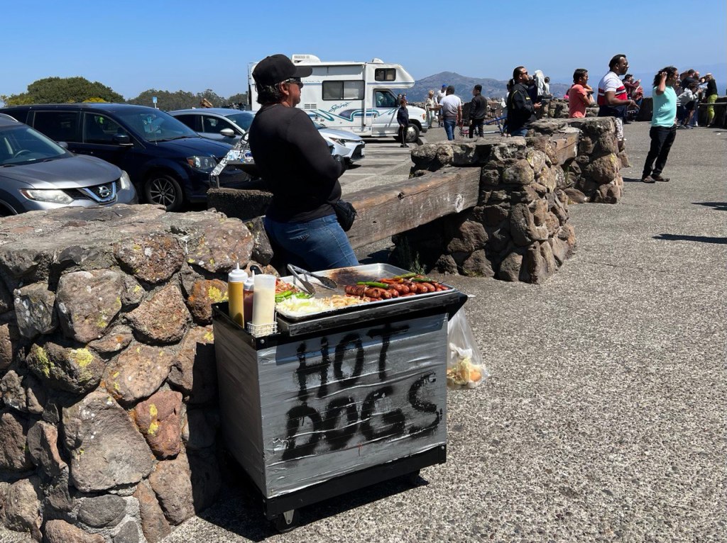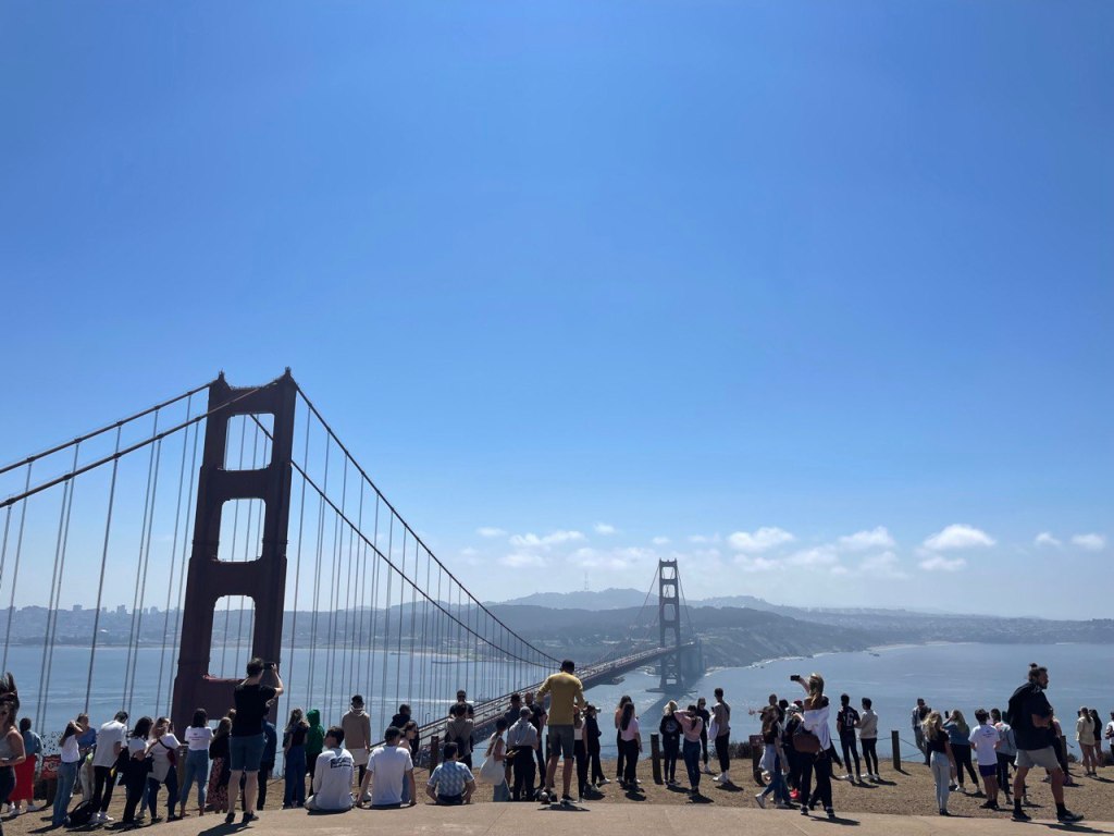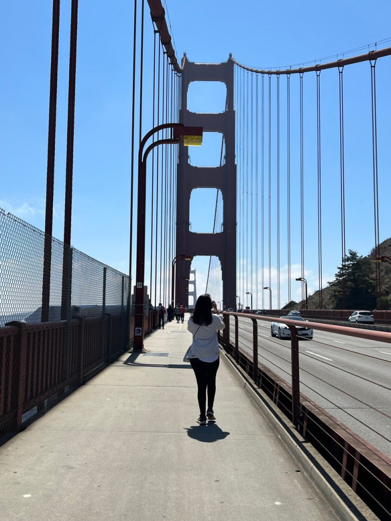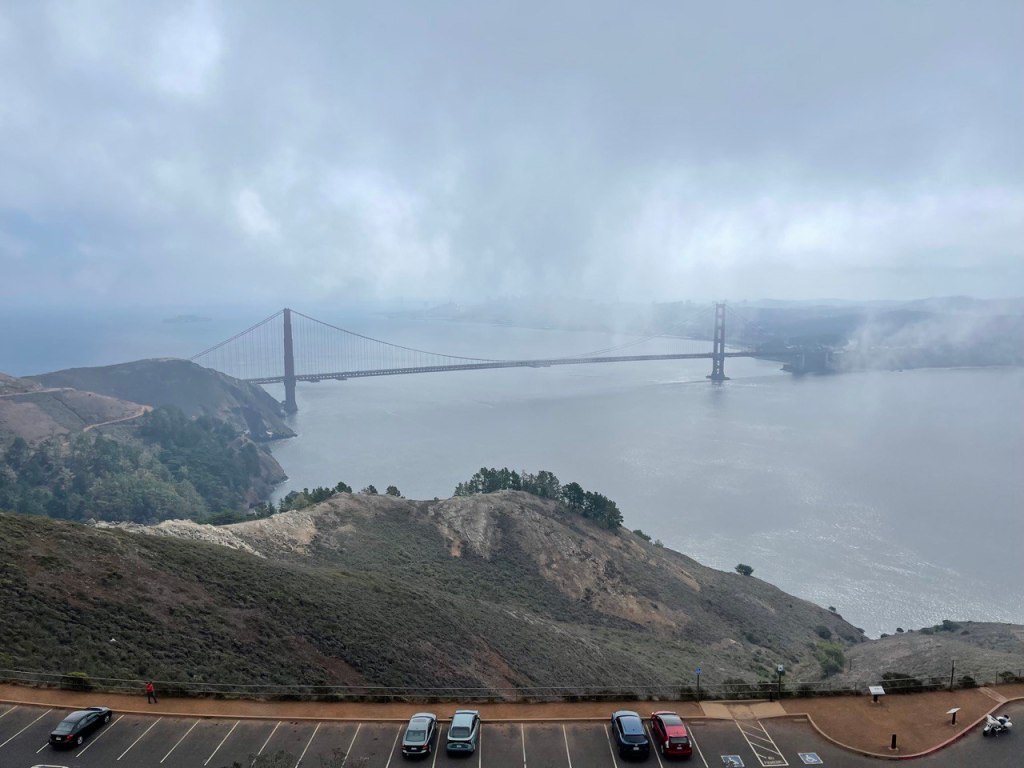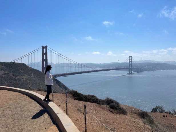Dari pusat kota, tidak ada transportasi publik langsung (ada pilihan satu bus plus jalan kaki sekitar 35 menitan) yang pergi ke Battery Spencer yang merupakan view points untuk melihat jembatan ini. Dengan berbagai pertimbangan, jadi kita naik taxi online langsung ke view pointnya lalu turun dengan jalan kaki dan melewati / menyembrangi jembatan Golden Gatenya. Tempatnya diketinggian gitu, jadi kita bisa lihat jembatan ini dengan kabut dari ketinggian keren juga. Tempat ini dulunya benteng pertahanan dari tahun 1897-1942. Kalau kalian bawa mobil, disini ada tempat parkir namun kalu sudah siang biasanya cepat penuh. Namun jangan lupa mengamankan barang bawaan kalian dari mobil yang diparkir karena disini ada papan peringatan berarti disini hot spot kejahatan. Selain itu, aku juga sering dengar kalau tingkat kejahatan pecahin kaca mobil untuk nyuri barang di San Francisco tinggi. Jadi pastikan tidak meninggalkan barang berharga didalam mobil / yang kelihatan menggiurkan untuk diambil. Saat jalan turunan kita sempat berhenti di dua spot untuk foto, semakin siang kabutnya sudah tidak ada lagi dan mataharinya bersinar terik.