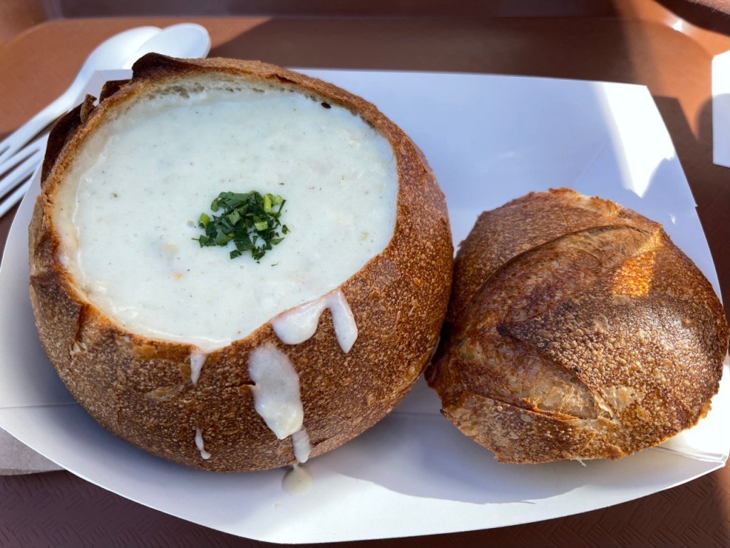 Untuk makan malam kita singgah di Boudin Sourdough. Kita makan salah satu makanan lokal disini yaitu Clam chowder. Katanya roti sourdough di tempat ini berbeda karena embun membuat adonan rotinya cenderung lebih asam, beraerasi, dan kenyal. Karena adonan rotinya dicampur dengan starter yang sudah dibuat berkali-kali sejak tahun 1849. Bourdin ini sudah menjual roti lebih dari 170 tahun. Tempatnya lumayan besar, ada toko untuk menjual berbagai jenis roti, counter untuk memesan makanan / ada restorannya juga, ada museum juga, dan kalian bisa melihat chef nya lagi buat roti karena ada jendela kacanya. Sop hangat ini cocok banget dengan udara di SF yang dingin. Berbicara soal embun, kota SF terkenal sebagai kota berkabut juga dan jenis kabutnya juga khusus karena berbeda dari kabut lembah pada umumnya yang cenderung menetap sedangkan kabut/ embun di SF itu bergerak. Bahkan lokal memiliki nama untuk embun ini yaitu ‘Karl the fog’.