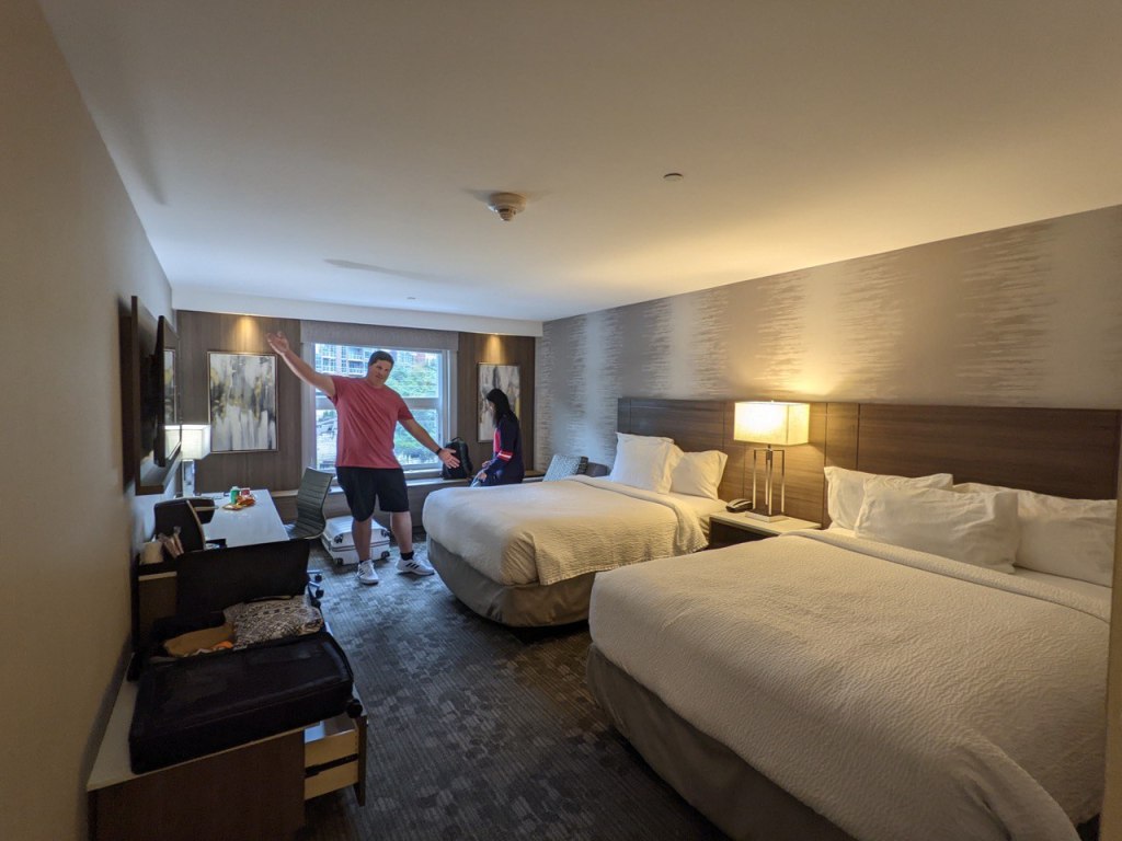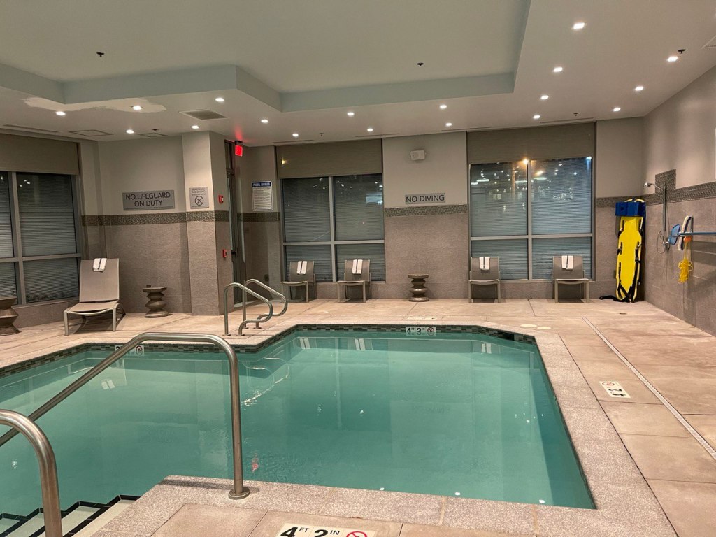 Sampai di tempat penginapan, langsung check in (prosesnya cepat dan staff nya friendly), dan dapat kamar juga dengan harga 5 Juta untuk 4 hari 3 malam (1.7 Juta/ malam). Kamar dan kamar mandinya luas, bersih, dan tempat tidurnya empuk. Lokasinya berada di dekat sungai Hudson (sungai pemisah antara New York dan New Jersey) dan strategis juga karena disekitar hotel kita ada restoran (resto burger, pizzeria, cafe, dunkin’ donuts, dll), toserba, pharmacy, dll. Dari daerah dekat sungai, bisa terlihat gedung-gedung pencakar langit NYC juga, enak banget nongkrong dekat sungai. Anw, di hotel ini juga terdapat fasilitas yang memanjakan tamu, yaitu kolam renang dalam ruangan lantai Lobby (kalau kolamnya rooftop pasti lebih keren yah pemandangannya, soalnya lokasi nya sudah ok), gym, tempat laundry bayar pakai aplikasi, minimarket, atm, dan ada juga Starbucks nya dekat lobby.