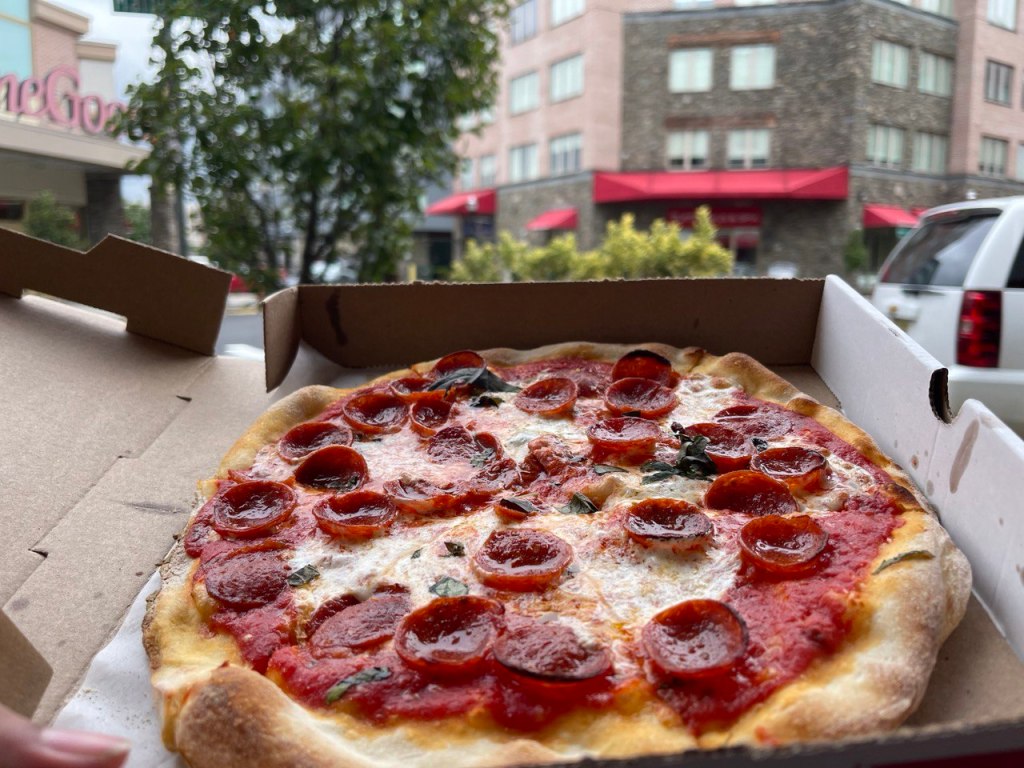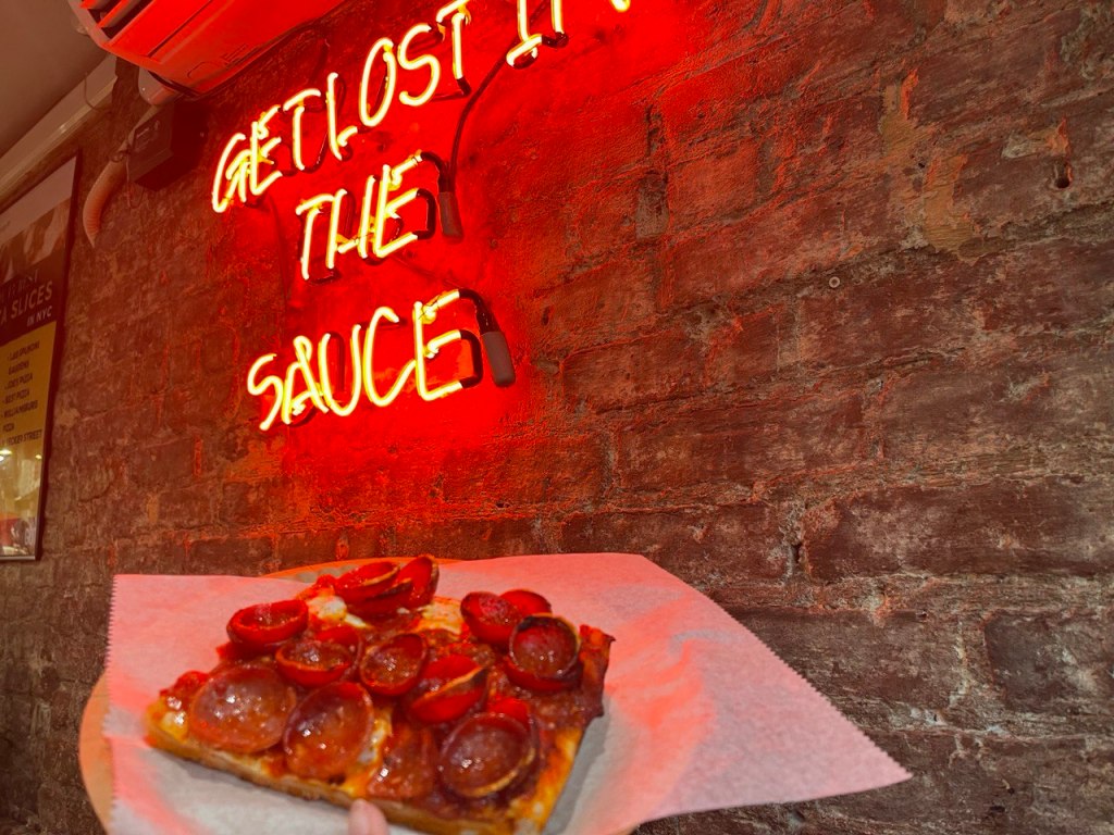 Dalam perjalanan mencari makan malam, kita singgah makan satu slice peperoni pizza pake madu panas diatasnya (harga 90k Rupiah) sebagai makanan pembuka. Wow, rasanya enak dengan base nya yang crunchy dan ternyata kombinasi manis & asin pizzanya enak juga. Peperoninya juga ngak pelit dan pelayanannya efisien & ramah.