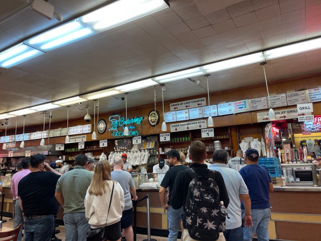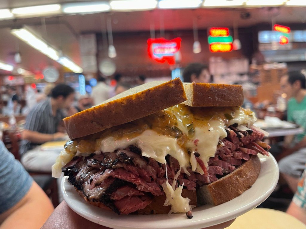 Makan malam kita di hari terakhir, kita cobain salah satu resto sandwich yang terkenal dan sudah buka sejak tahun 1888 (berusia lebih dari 120 tahun). Kita antri di salah satu konternya untuk pesan dengan membawa kertas kecil yang telah dibagikan pas kita masuk (jangan sampai hilang kertas ini kalau tidak mau didenda USD 50). Kertas kecil / tiket ini nanti akan ditulis apa pesanan kita, kita pesan Katz’s Reuben sandwich (400k Rupiah) dengan isian irisan corned beef, sourkraut (kubis/kol yang difermentasi), keju swiss, dan saus nya yang melimpah. Hampir tidak bisa habis padahal sudah makan berdua, karena porsinya yang jumbo.