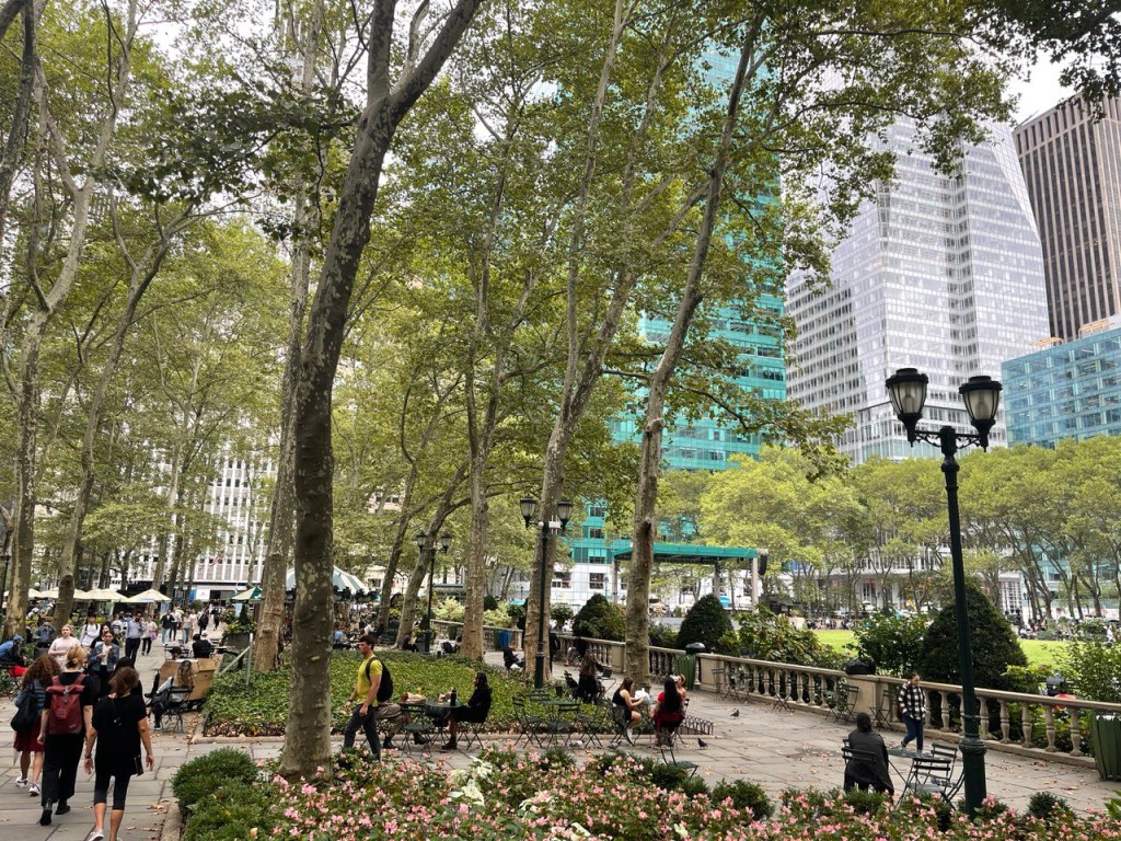 Kemudian, kita ke Bryant park yang tepat dibelakang Perpustakaan umum New York. Disini tampak hijau dengan banyak banget tempat duduk, tempat main pimpong, di beberapa spot di taman ini ada restoran, cafe yang berjualan kopi & pastry gitu, toko dessert, dan disini juga kita lihat beberapa orang main permainan papan (catur, uno, jenga, monopoly, dll). Kita hanya duduk-duduk istirahat sebentar sambil memikirkan jalur atau stop kita selanjutnya.