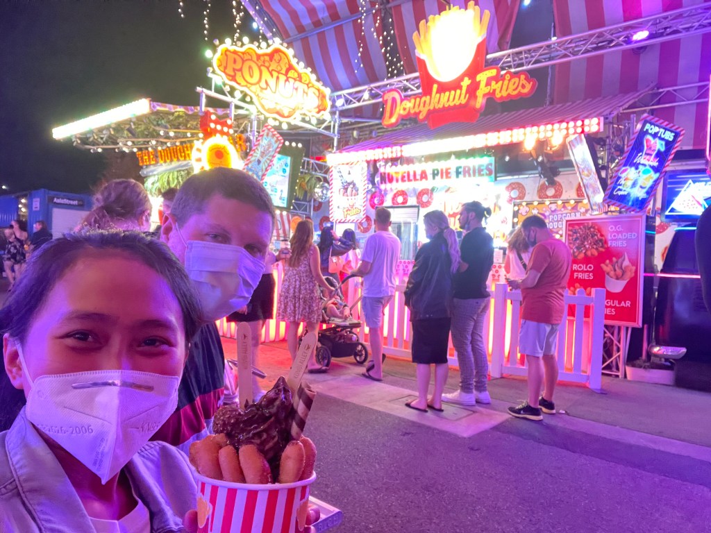 Akhirnya kita cobain Adobo Ayam (harganya AUD 15), makanan nasional Filipina. Rasanya mirip semur ayam cuman ada rasa asamnya dari vinegar (cuka). Makanannya dihidangkan dengan nasi dan rasanya enak banget. Karena memang aku tuh jadi suka makanan asam manis gitu semenjak tinggal di Australia karena sudah nyobain berbagai jenis makanan dari berbagai negara disini. Sebelum pulang, kita sempatin cari makanan penutup. Lampu-lampu neon di area dessert itu lucu-lucu, jadinya kita nyobain doughnut fries. Kita pilih yang Doughnut Fries yang pake ice cream rasa Ferrero Rocher yang harganya AUD 15. Kalau kalian kesini jangan lupa bawa uang tunai, karena kalau bayar pakai kartu kebanyakan stall ada biaya tambahan sekitar 1.9%