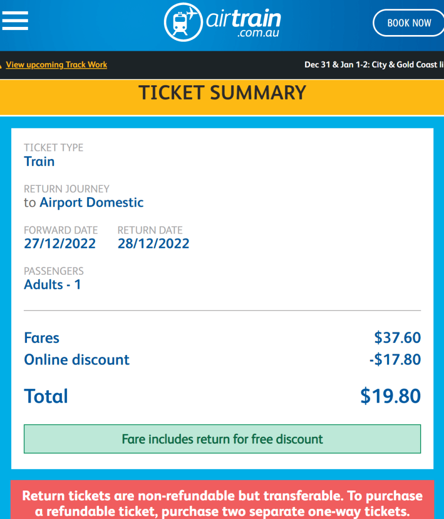 Setibanya di bandara Brisbane, kita menuju ke tempat tunggu AirTrain untuk naik kereta yang menuju pusat kota, Central Station pemberhentian yang paling dekat dengan hotel tempat kita menginap. Kereta ini juga berhenti diberbagai tempat untuk lebih lengkapnya termasuk jam-jamnya juga, kalian bisa cek website mereka di airtrain.com.au. Tiket keretanya kita pesan online dan harganya AUD 19.80 (dapat diskon pesan online Aud 18.80) untuk tiket pulang pergi sedangkan kalau sekali jalan Aud 15.30 (diskon pesan online Aud 4.5 saja). Kalian juga bisa beli tiket di counter nya sebelum naik. Namun kalau pesan online dan tiket pergi pulang akan lebih banyak menghemat. Harga akan bervariasi tergantung jaraknya dan waktu termpuh sekitar 20an menit dari bandara ke pusat kota. Selain ke pusat kota atau berbagai suburb di Brisbane, Airtrain ini juga punya jalur ke kota Gold coast, yang berhenti di beberapa stasiun pemberhentian utama-nya (Coomera, Helensvale, Nerang, Robina, dan Varsity Lakes. Kalau mau ke daerah pantainya kalian bisa sambung naik tram lokal Gold Coast dari Helensvale seperti ke Southport, main beach, sufters paradise, broadbeach, dan convention centre.