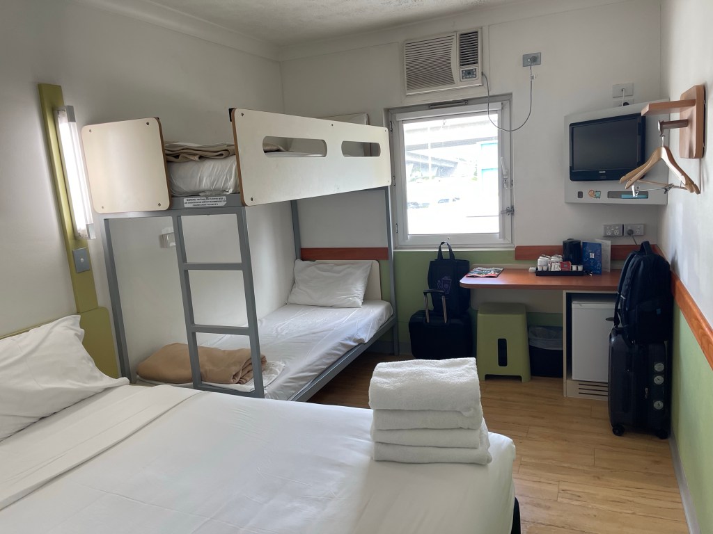 Kalau kalian cari tempat tinggal yang terjangkau yang dekat dengan bandara (8 menit berkendara) dan premium outlet (namanya DFO di Australia, 5 menit berkendara), kalian bisa mempertimbangkan Hotel Ibis Budget Airport ini. Namun tidak ada restoran disekitaran hotel ini, hanya ada tempat makan dengan berkendara sekitar 4 menitan. Lebih nyaman kalau kalian punya kendaraan yang tinggal di hotel ini. Kita bisa check in paling cepat jam 12 siang dan check out jam 10 pagi. Kita pesan kamar yang standar untuk tiga orang yang paling murah dapat queen bed dan satu single bunk bed yang diatasnya dengan harga 1.4 juta lewat aplikasi accor. Namun karena kita punya status gold, kita dapat upgrade satu tipe kamar diatas. Bedanya, kita semua dapat tempat tidur dibawah dan kamarnya lebih luas. Ada fasilitas makan pagi 100k Rupiah per orang untuk roti & selai , cereal, susu, dan orange juice. Kalau pengen jajan, terdapat snack dan minuman kemasan yang ada di vending machine di lantai dasar. Tidak ada dapur, namun ada microwave yang dipakai bersama di area makan pagi, kalau kalian mau memanaskan makanan. Kamar dan sepreinya bersih, ac nya bekerja dengan baik, wifi bagus, dan bunk bed nya jug kokoh tidak ada suara. Hotel 3 lantai ini tidak memiliki lift, jadi kalau kalian punya banyak barang, kalian mungkin bisa request kamar di lantai dasar. Kalau yang bawa mobil, terdapat banyak spot parkir dan gratis.