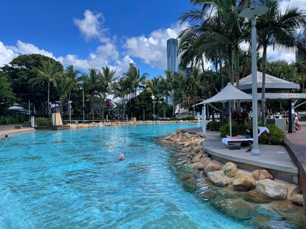Tempat ini merupakan pantai buatan yang berada di dalam kota Brisbane yang memiliki laguna biru yang berkilau dengan pasir putih dan tanaman tropis. Pantai ini berada di area South Bank Parklands yang luas dan hijau (sangat indah), tepat ditepi sungai Brisbane. Kalian bisa bebas berenang disini gratis. Tentunya pantai ini aman dan ramah untuk anak-anak, tersedia taman bermain air interaktif untuk anak-anak juga. Selain itu terdapat berbagai fasilitas lainnya seperti penjaga pantainya juga yang berpatroli, toilet umum, area untuk berjemur, tempat duduk, tempat piknik, tempat BBQ gratis tersedia dengan gas nya juga (tinggal bawa daging nya, alat makan, dan jangan lupa bersihin juga setelah dipakai, ok), area rumput hijau (suka tidur-tiduran dibawah pohon rindang disini), tempat berteduh, fountain air minum, dan berbagai pilihan tempat makan (cafe & restoran). Pokoknya tempatnya nyaman untuk bersantai dan berkumpul dengan keluarga.