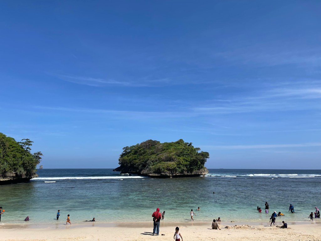Selain keliling-keliling kota naik motor, aku dapat info dari internet kalau pantai di Malang juga keren-keren namun memang agak jauh. Setelah konfirmasi dengan sepupu, mumpung ada motor juga, kita ke pantai Teluk Asmara dan Gatra yang berada di Selatan kota Malang dengan motoran sekitar 6 jam-an pulang pergi dari penginapan kita. Kita pergi pagi sekitaran jam 10 pagi dan sampai hotel sudah larut malam malam. Wah pemandangan pantainya keren, gelombang laut nya juga tidak terlalu kuat karena ada pulau karang di sekitar pantai ini, air nya jernih, pantainya juga bersih dan banyak orang juga disini. Selain mandi di pantai, banyak juga yang datang piknik dan berkemah disini. Kalian bisa sewa peralatan berkemah juga disini. Namun jalan masuk ke pantainya masih berbatu, mudah-mudahan kalau pantainya sudah tambah ramai, mereka bisa memperbaiki jalannya. 🙂