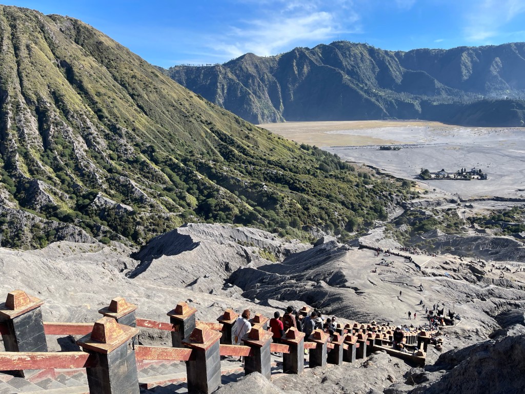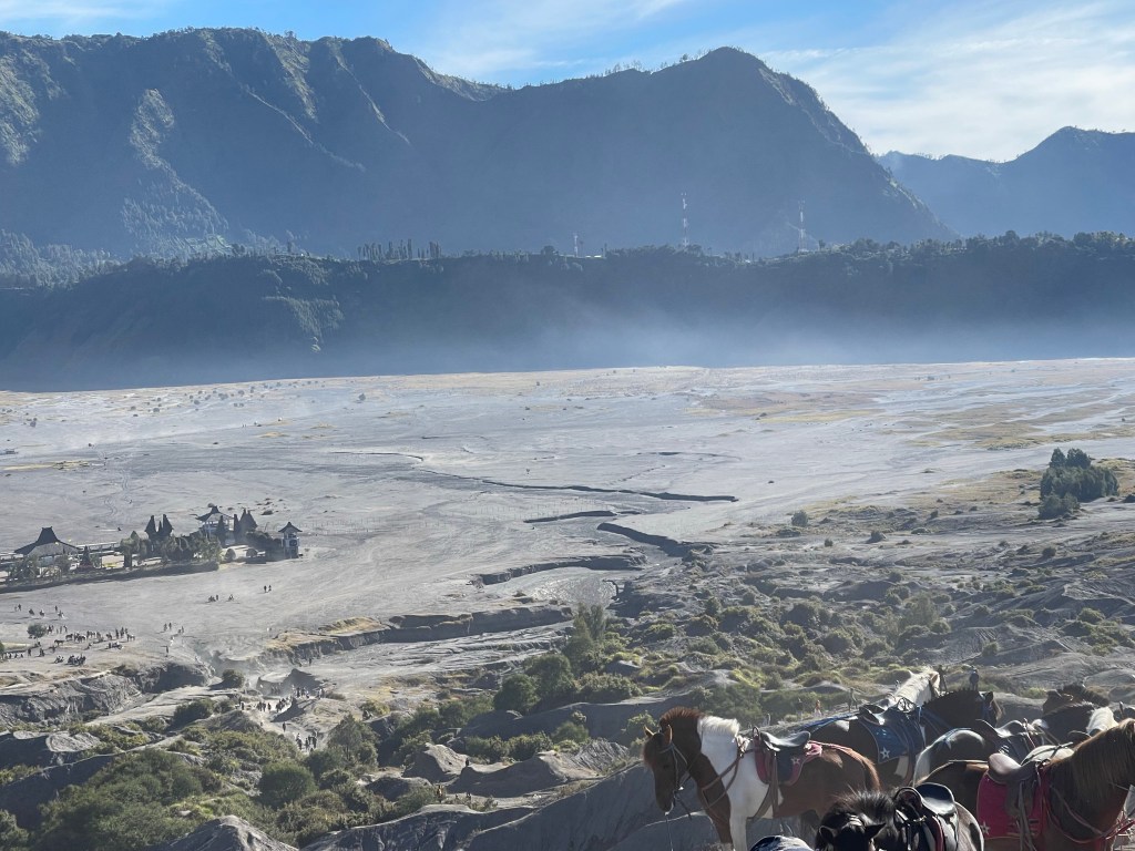 Jam 6 pagi sharp, kita sepakat berkumpul kembali ke mobil jeep kita untuk melanjutkan perjalanan ke Bukit Widodaren untuk spot berfoto. Disini kita hanya berhenti 15 menit lalu lanjut ke Kawah Bromo. Dari tempat parkir, kita jalan kaki melalui padang berpasir untuk menaiki 250 anak tangga yang menghantarkan kita untuk melihat Kawah Bromonya. Kalau kalian capek jalan kaki, tersedia kuda yang bisa kalian sewa untuk mengantarkan kalian pergi pulang dari parkiran ke bawah tanggah untuk ke Kawah. Harga sewa nya bervariasi sekitar 150k pulang pergi. Aku ngeliat kuda dan medannya jadi ngak tega untuk horse riding, jadi kita jalan kaki santai saja ok.