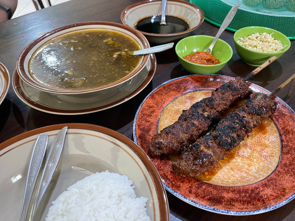 Jalan-jalan ke Malang, belum complete kalau belum nyobain Sate Gebug dari Warung legendaris Malang yang sudah ada sejak tahun 1920. Tempatnya sangat dekat dari hotel kita tinggal hanya jalan 5 menit dan kita kesini untuk makan pagi. Walaupun sudah terkenal dan sudah ada sejak lama, lokasinya masih sama dan tempat duduk nya juga tidak terlalu banyak. Kita pesan Sate tanpa lemak, rawon dan nasi putih. Yummy. Sate sapinya enak dan empuk banget, begitu juga dengan rawonnya. Omg, I am so delightful and keep my tummy happy for the rest of our trip in Malang. Katanya daging sapi yang dipakai adalah bagian sirloin dan tenderloin nya saja, lalu daginya diiris tipis dan di pukul supaya empuk namun tidak sampai hancur dan putus supaya gampang untuk ditusuk di tusukan sate. Sebelum dibakar di arang, satenya di marinasi dengan bumbu rahasian dari generasi ke generasi. Sekilas satenya mengingatkan aku dengan makanan timur tengah ‘kofta’, namun rasanya sate gebug memang mantap. Walaupun harganya lumayan, namun untelan satenya besar-besar dan enak koq. Makan satu tusuk sate, nasi, dan kuah rawon saja sudah kenyang pol. Sebagai pecinta sate, pengen kesini lagi kalau ke Malang.