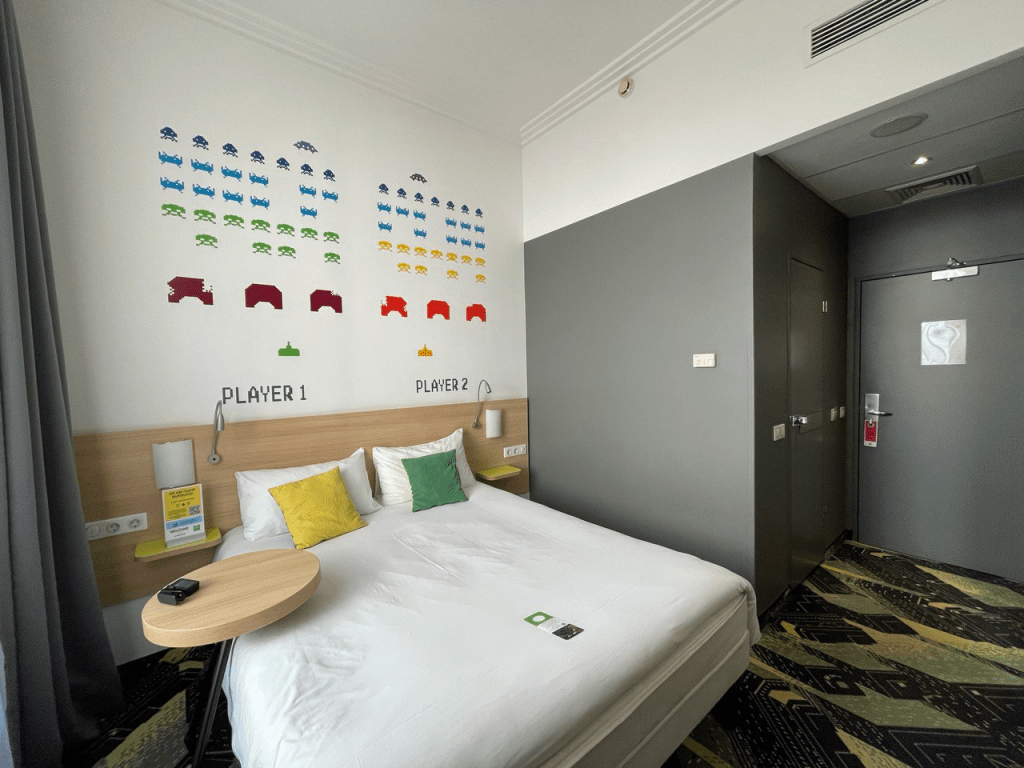 Walaupun kamarnya tidak tidak terlalu besar (sering bertabrakan sama suami saat jalan di kamar, ehehe ya sekecil itu), namun kamarnya bersih. Di area resepsionisnya tersedia air minum dan kopi dari mesin yang tersedia gratis 24 jam. Hotelnya bertemakan game retro gitu, jadi mengenang masa kecil main game ‘pac-man’. Yang lahir tahun 90-an, pasti relate sama aku (ehehe). Di tempat duduk area lobby hotel, terdapat game gitu yang bisa kita pakai, tersedia untuk umum. Sore hari, kita juga nukar voucher minum gratis (welcome drink), lumayan.
