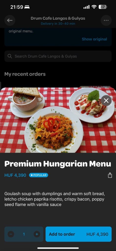 Setelah jalan-jalan yang melelahkan, kita langsung balik ke hotel. Kita tidak sempat makan diluar, karena sudah mulai gelap dan besok paginya kita ada jadwal kereta jam 7.40 pagi. Jadi kita putuskan untuk pesan makanan lewat aplikasi Bolt. Tidak mau melewatkan kuliner lokal, Ty yang in charge untuk pesan makanan, begitu sampai hotel suami langsung hunting makanan. Sambil nunggu, aku beres-beres koper untuk besok. Akhirnya pesanan sampai juga, gile makannya banyak juga. Ternyata Ty kalap, suami pesan banyak banget makanan. Pesan 2 menu paket yang populer mereka, yang masing-masing terdiri dari makanan pembuka, utama, dan penutup. Harganya 4,390 Forint per paket (192k), lumayan juga yea… Ty beli dari Drum Cafe Budapest, tempat makan yang menjual makanan Hongaria. Pastinya kita pesan Beef Goulash, hidangan nasional Hongaria. Teksturnya seperti Rendang, dagingnya empuk dan rasanya juga enak walaupun tidak ada pedas-pedasnya seperti Rendang di lidah kita. Enak banget makan yang hangat-hangat saat cuaca lagi dingin di malam hari.