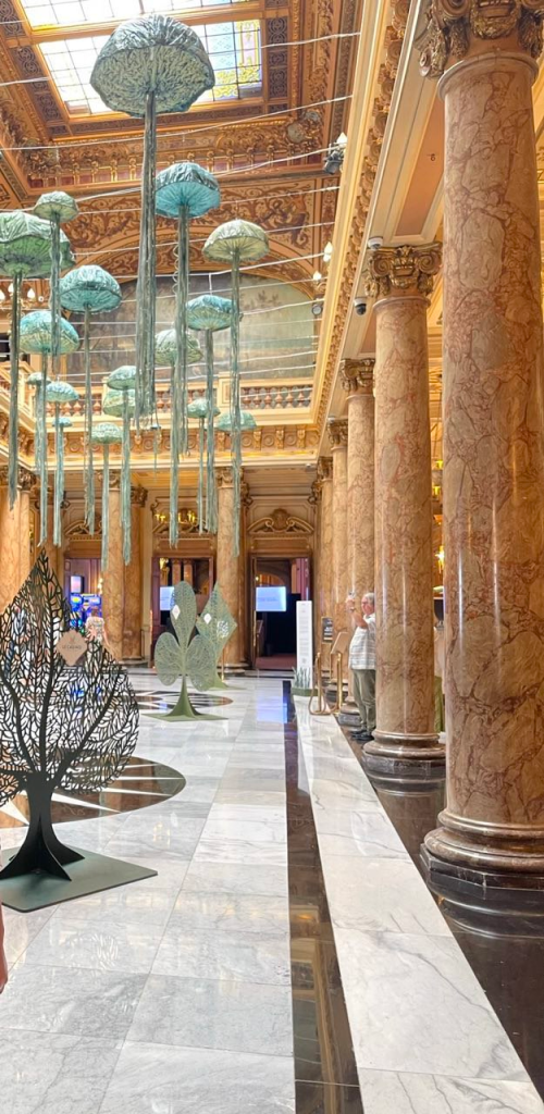 Keluar dari stasiun kereta Monte Carlo, kita langsung jalan kaki menuju pemberhentian pertama yaitu Monte Carlo Casino. Dari luar tidak terlihat seperti kasino karena berada di dalam gedung bersejarah dengan arsitektur khas Eropa yang megah. Bangunan dan interior nya juga sangat mewah. Kalau kalian pencinta film Hollywood, James Bon, kalian pasti tau kasino ini, salah satu kasino terbaik di dunia. Karena masih pagi, kasino nya belum buka (nanti buka dari jam 2 siang sampai 4 subuh), jadi kita hanya sampai di area tunggunya. Setidaknya sudah lihat bagian dalam gedung saja sudah sebagus itu apalagi ruangan lainnya. Seperti masuk di dalam istana kerajaan, didominasi warna emas, marmer, ada karpet merah elegan, atap yang stained glass, chandelier (lampu gantung mewah), pokoknya mewah deh. Tiket masuk ke kasino bervariasi dari 10-15 Euro tergantung waktu kunjungan.