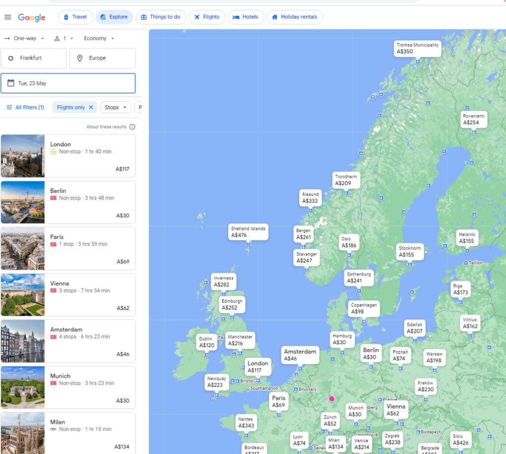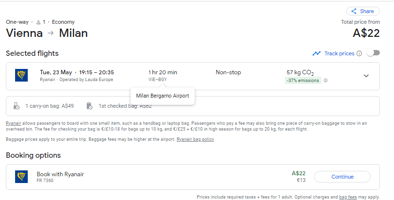 Saat menyusun itinerary Eropa di atas juga aku sambil membandingkan berbagai jenis transportasi antar negara berdasarkan harga dan lama perjalanan, sehingga mayoritas aku menggunakan pesawat untuk pindah negara menggunakan google flight. Web nya mudah digunakan dan fitur-fiturnya yang sangat membantu. Misalnya ada grafik harga tiketnya dan fitur ‘melacak harga’ dimana kita akan dikirimkan update perubahan harga tiket pada tanggal penerbangan dan rute yang kita inginkan melalui alamat email kita.
