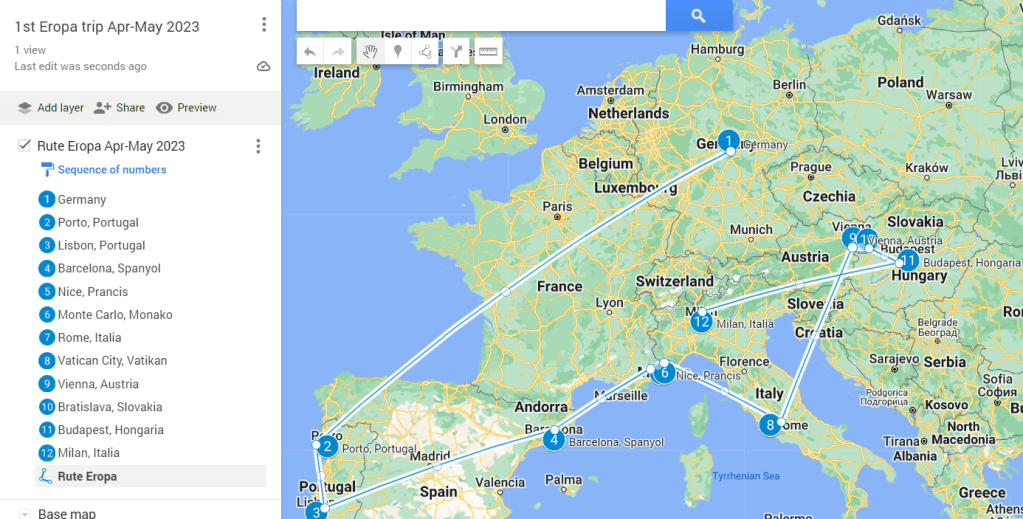 Untuk perjalanan kali ini, kita tidak spesifik harus ke negara mana saja yang harus didatangi untuk pertama kali. Namun kita lebih flexible dan menyesuaikan dengan tiket pesawat murah atau transportasi antar negara lainnya dan beberapa rencana yang harus kita lakukan yaitu menghadiri acara pernikahan sepupu suami di Portugal dan mengunjungi tante suami yang ada di Wolfsburg, Jerman. Selain itu walaupun terlihat negara-negara di Eropa berdekatan di map, namun tetap saja memakan waktu kalau kita mau mengunjunginya semua (oops). Karena kita memulai perjalanan kita dengan menghadiri pernikakan keluarga di Portugal, jadi destinasi selanjutnya yaitu negara yang terdekat (disekitar Eropa Selatan dan Timur) sehingga waktu tempuh nya juga tidak terlalu panjang dan harga nya bisa lebih murah. Setelah beberapa hari utak atik google flights dan situs pencarian sejenis, akhirnya rampung juga rute perjalanan kita di Eropa.