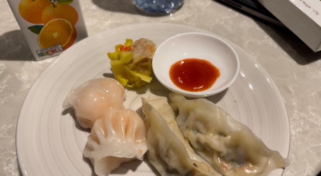 Waktu itu tersedia pilihan sandwich dingin (chicken pesto dan egg mayo). Sedangkan untuk hot food nya ada banyak pilihan dumpling termasuk yang vegetarian juga ada. Makan pagi, aku ambil laksa, enak dan nikmat banget rasanya.