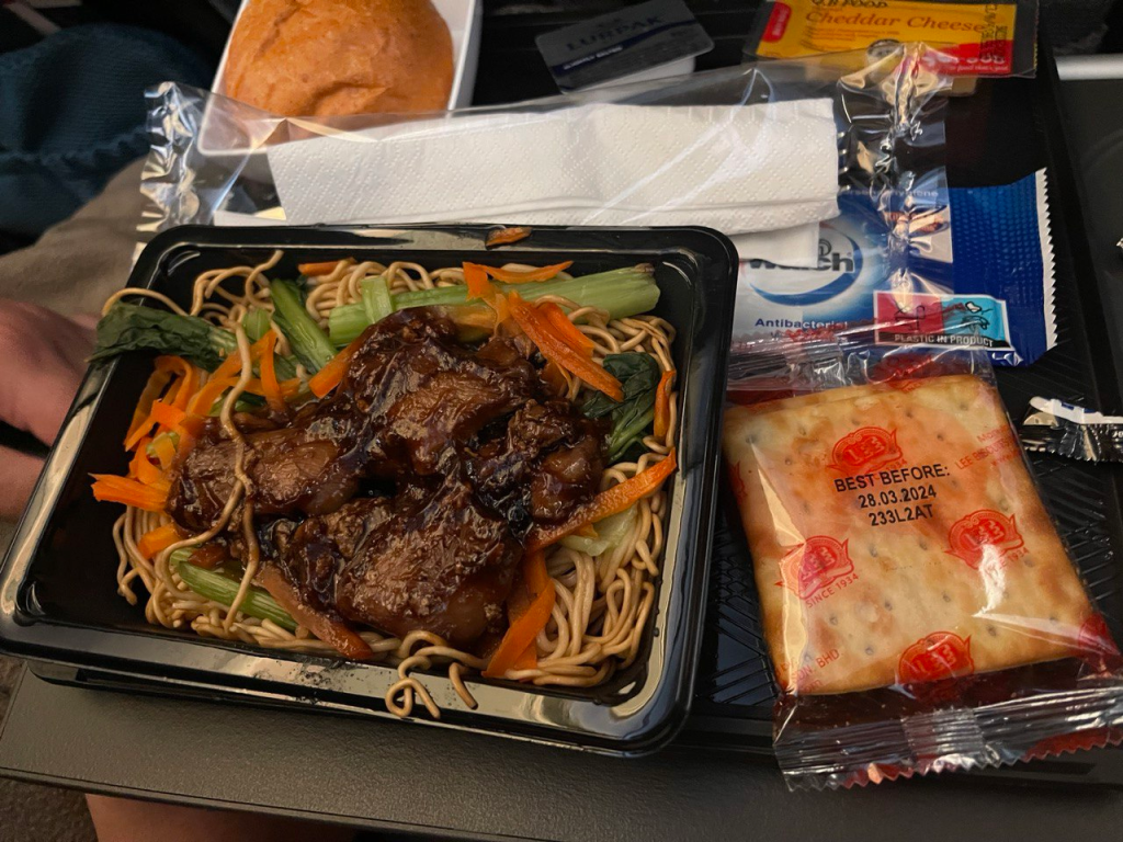 Jangan khawatir kalau kalian masih lapar atau pengen snacking, kalian bisa minta snacks ataupun mie kuah sama pramugarinya. Kita coba minta snacks nya, kita langsung dapa 4 jenis snacks dari pramugarinya. Ada coklat kit-kat, roti pandan Singapura, sour and cream chips (snack dari Irlandia), dan dry Cranberries (Cranberres kering). Tetangga kita yang duduk di depan pesan mie kuah, harum mie nya sampai kecium. Kita jadi ileran jadi pesan juga mie kuah rasa Tom Yum, lumayan dingin-dingin di pesawat makan yang hanget-hanget yang berkuah. Sekitar 2 jam kemudian, makanan kedua pun tiba. Ada 2 jenis makanan yang ditawarkan lagi yaitu ‘Sweet and Sour Fish’ (Ikan asam manis, rating dari aku 9/10) dan Spagheti Bolognese (8.5/10, spaghetti nya juga enak). Makanannya disajikan dengan makanan penutup ‘cheese cake’, bread roll & butter (roti), dan cheddar with crackers. Kita berdua pesan keduanya yang kita sharing, supaya bisa rasain keduannya. Aku suka ikan asam manisnya, enak.
