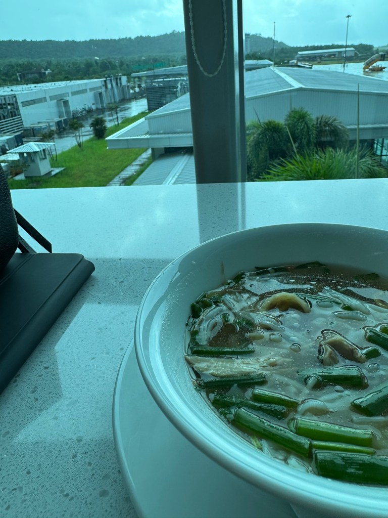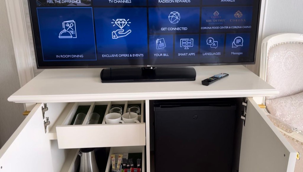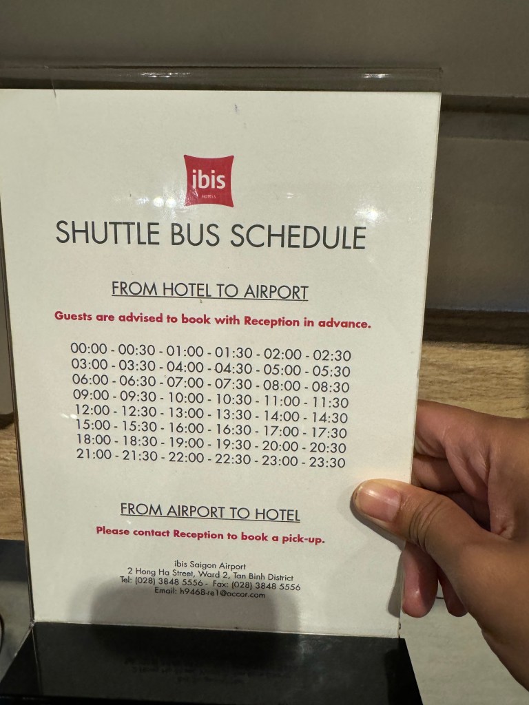 Setelah booking penginapan lewat website booking.com, kita langsung dapat pesan untuk memilih jam berapa shuttle bus kita datang. Terdapat timetable/ jadwal shuttle bus yang tersedia dan kita pilih yang jam 9.45am. Sesampainya di hotel, kita langsung ke resepsionis untuk check-in hotel sekitar jam 11.35am, bayar penginapan langsung ditempat dan sambil nunggu kita dapat welcome drink. Walaupun sudah check-in, namun kita belum bisa masuk kamar (jadwal check-in jam 2 siang). Karena lapar, kita minta diantar ke Grand World menggunakan buggy yang tersedia gratis (drop-off dan pick-up) sebagai fasilitas hotel. Kita juga sekalian booking shuttle bus untuk drop di bandara dan ternyata kita dapat late check out sampai jam 2 siang. Terdapat tempat pemberhentian khusus golf cart di Grand World, tepat berada di Urban Park nya (salah satu tempat wisata di area Grand World nya) dan di depannya ada tempat makan & minimarket. Kita makan di salah satu tempat makan itu lalu beli 1 botol air minum kemasan 5L, harganya 50k vnd (Rp. 32k). Sedangkan makan siang, kita pesan Pho Bo (Sop mie daging sapi, 70k vnd, Rp 45k), Com Tam Ribs (nasi campur daging babi panggang, 70k vnd, jus mangga (60k vnd, Rp 38k), dan es kopi susu (40k vnd, Rp 25k). Tidak lama kemudian, kita dapat telepon whatsapp dari hotel kalau kamar kita sudah siap sekitar jam 12.30pm.