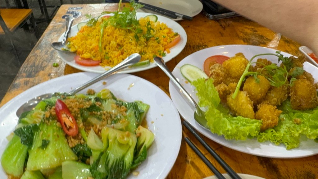 Pasar malamnya tidak terlalu besar ternyata, jam 6pm tidak terlalu ramai, nanti sekitar jam 7.30pm keatas baru mulai banyak orang. Banyak tempat makan yang menjual masakan laut dari hasil tangkapan nelayan yang masih hidup ditempatkan di loyang besar berisi air. Setelah jalan dari ujung ke ujung melihat berbagai pilihan tempat makan untuk makan malam, akhirnya kita balik lagi ke restoran yang kita temui di awal-awal. Saat itu yang makan hanya kita dan satu pasangan lagi. Semakin malam, restoran mulai penuh dan di beberapa resto sekitarnya juga. Padahal kita makannya di tempat makan di dalam pasar, pegawai nya mengambil pesanan kita menggunakan aplikasi di handphone gitu, bukan yang manual yah. Kita pesan smootie mangga 40k vnd (IDR 26k), air kelapa 40k vnd (air terasa agak tawar), cumi goreng 180k vnd (IDR 115k), scallops 150k vnd (IDR 96k), nasi goreng 90k vnd (IDR 59k), sayur tumis Bok Choy 80k vnd (51k), garlic bread 25k vnd (IDR 16k) dengan total yang kita bayar untuk makan malam berdua yaitu sekitar 615k vnd (IDR 394k). Kita sangat menikmati makanan dan suasana pasar malamnya saat itu. Lumayan juga harganya yah. Setelah makan, kita langsung balik hotel dengan Grab mobil yang kita pesan sendiri lewat aplikasi harganya sekitar 269k vnd (IDR 174k).