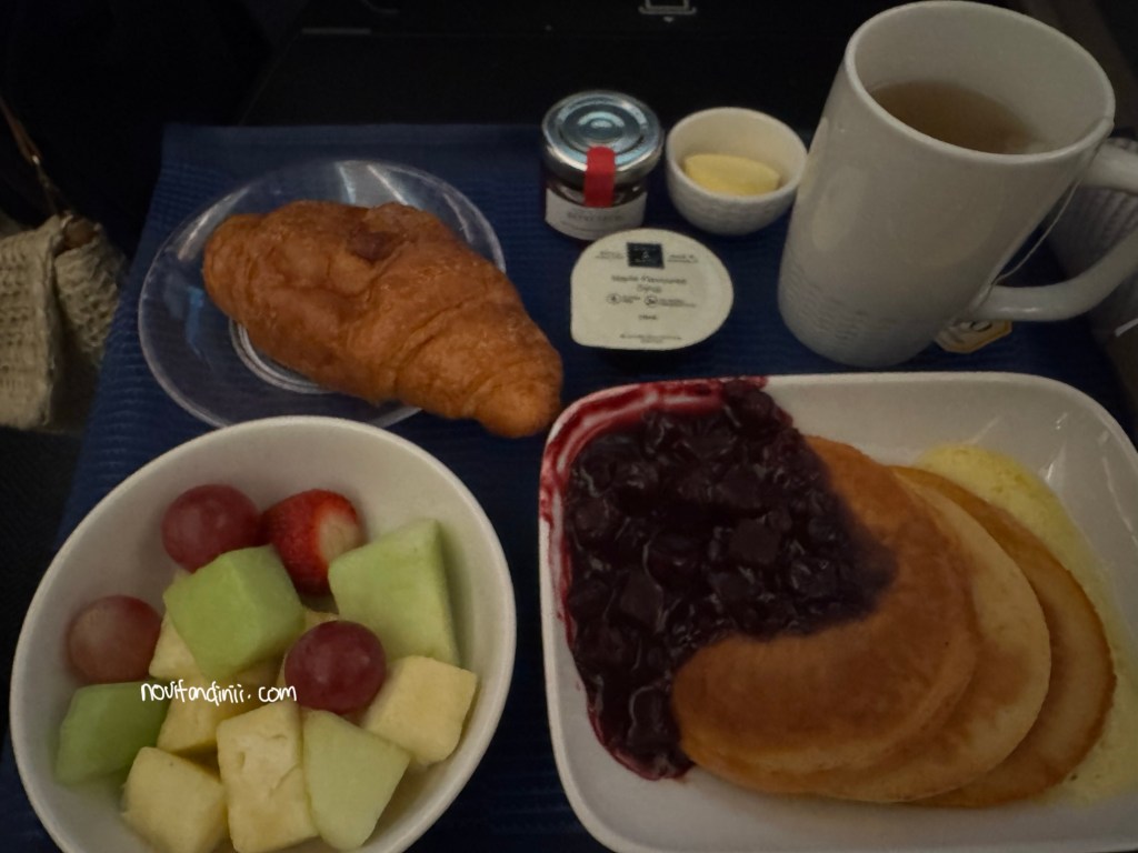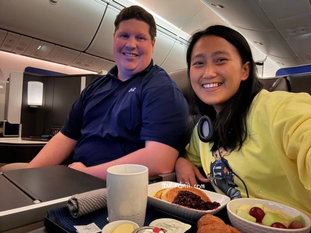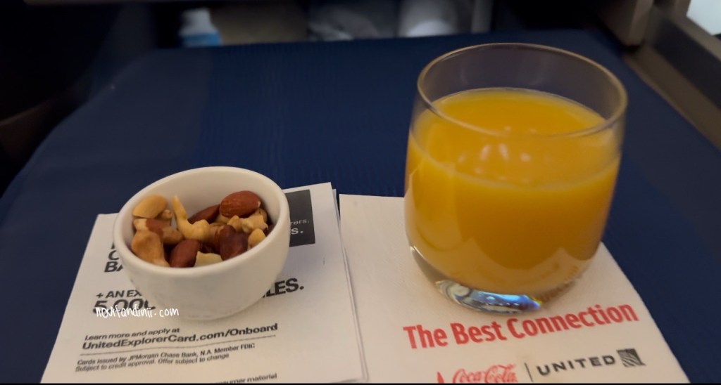 Belajar dari pengalaman naik maskapai tetangga, kita akhirnya memutuskan memesan secara online makanan utamanya beberapa hari sebelum keberangkatan. Supaya kita tidak kehabisan stok makanan yang pengen kita makan saat di pesawat. Namun kita hanya bisa pesan makanan utama secara online. Sebelum pesawat lepas landas, pramugari/ pramugara United Airlines akan mengambil semua pesanan makanan kalian dan membagikan ‘welcome drink’ (biasanya ada pilihan Champagne, wine, dan juices). Sekitar 1 jam setelah lepas landas, kita dibagikan ‘pre-meal beverage and snack’ dan kita pesan jus jeruk dan kacang-kacangan. Nyaman sekali kabin nya dan pramugari/ pramugaranya sangat baik dan ramah sekali dari awal sampai akhir perjalanan. Salah satu pramugara sempat menawarkan untuk menggantung jaket ku didalam lemari khusus untuk pakaian crew pesawatnya.