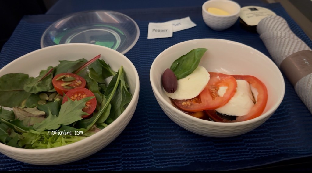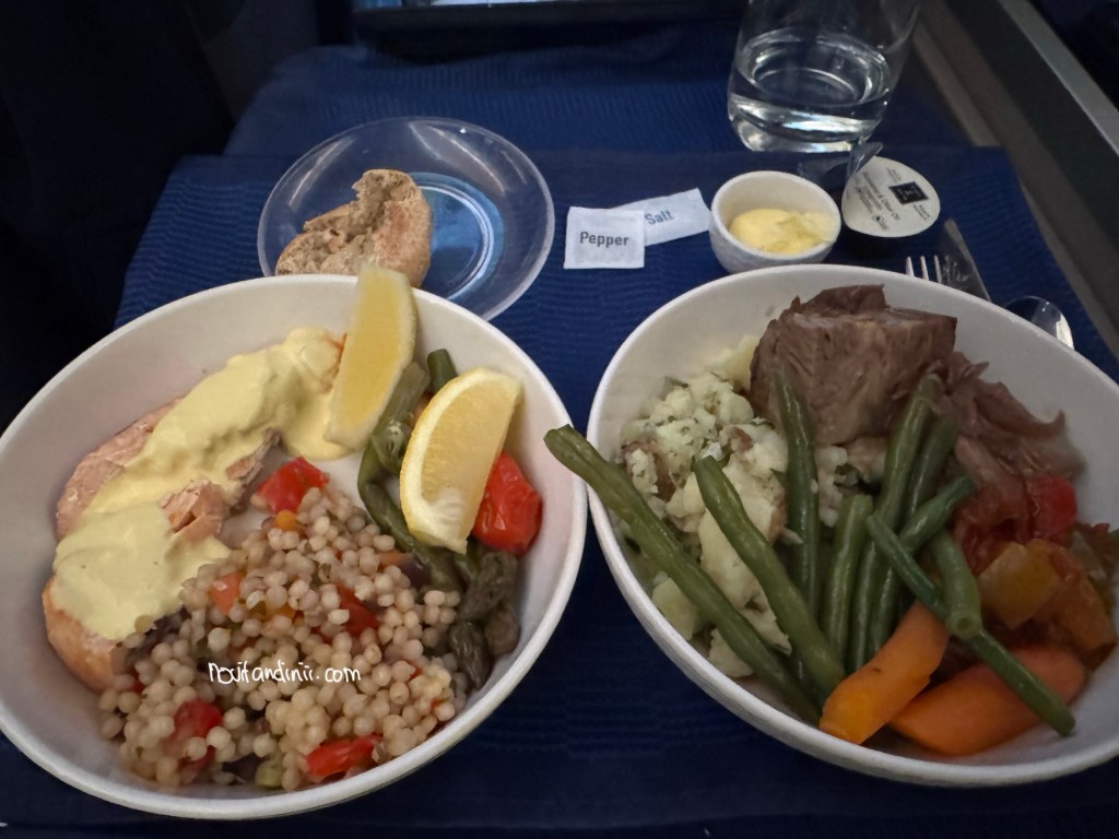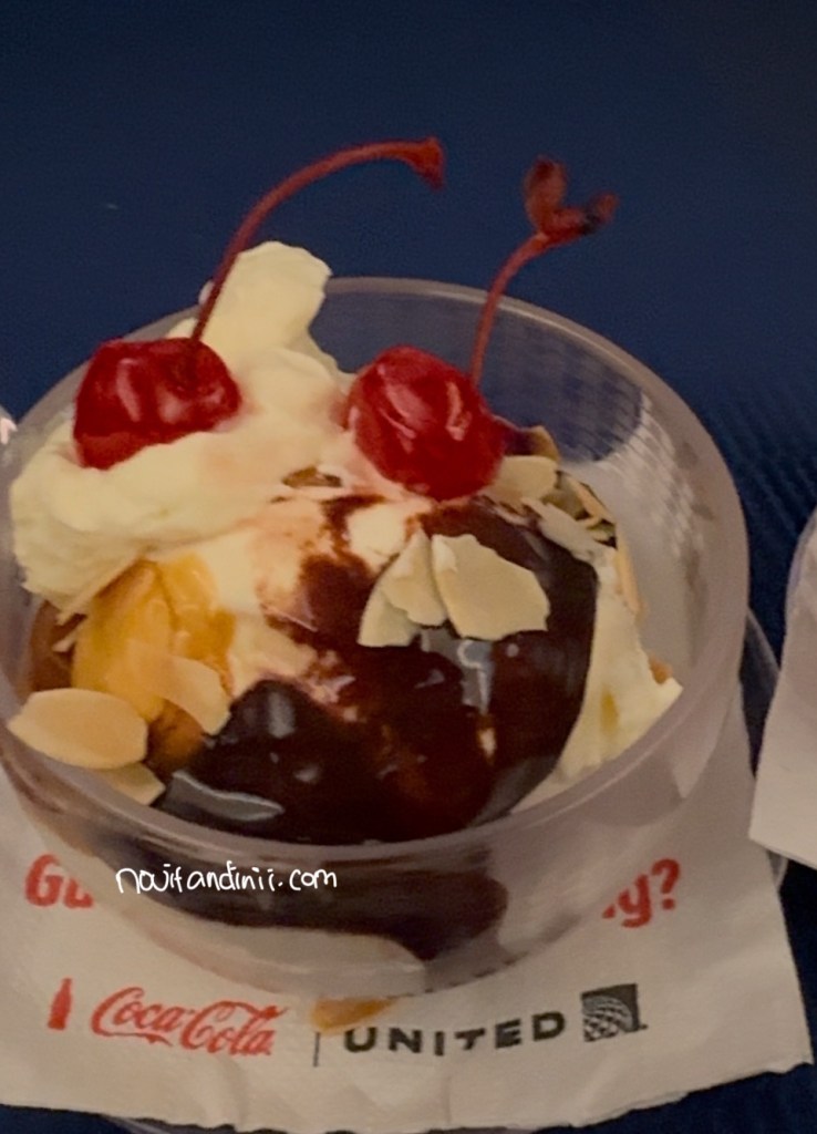 Untuk sesi makanan utamanya, kita pilih ‘marinated halloumi cheese with olives, orange, marinated cucumber, spiced honey and crackers’ sebagai makanan pembuka. Makanannya juga datang dengan ‘garden salad, roti dan butter. Halloumi itu adalah jenis keju vegan favorit yang kalau di panggang, terlihat seperti daging karena kejunya tidak meleleh dan rasa serta aromanya juga mantap. Cenderung memiliki rasa asin sedikit tajam dengan tekstur yang kenyal. Selanjutnya makanan utama, aku pesan ‘Roasted Tasmanian Salmon Fillet with Israeli couscous, roasted vegetable, blanched asparagus, roasted cherry tomatoes and lemon hollandaise sauce’. Apapun menunya, hampir selalu pesan hidangan favorit, ikan salmon. Tidak terlalu suka couscous karena teksturnyaf seperti makan boba, namun kalau makannya dengan salmon, habis juga. Untuk makanan penutup, kita tidak melewatkan ‘ice cream sundae’, hidangan pencuci mulut andalan. Pramugari nya akan jalan mendorong trolley es cream sundae. Mereka menawarkan es krim Vanilla dengan berbagai pilihan toppings, sesuai dengan keinginan kita. Ada pilihan saus coklat, karamel, M&M, cherry, remah-remah oreo, saus strawberry dan sebagainya. Sejauh ini, kita sangat menikmati perjalanan kita dengan United Airlines. Pelayanannya ramah, attentive, dan makanannya juga enak. Sangat setuju, kalau es krim sundae ini jadi menu favorit. Yum yum.