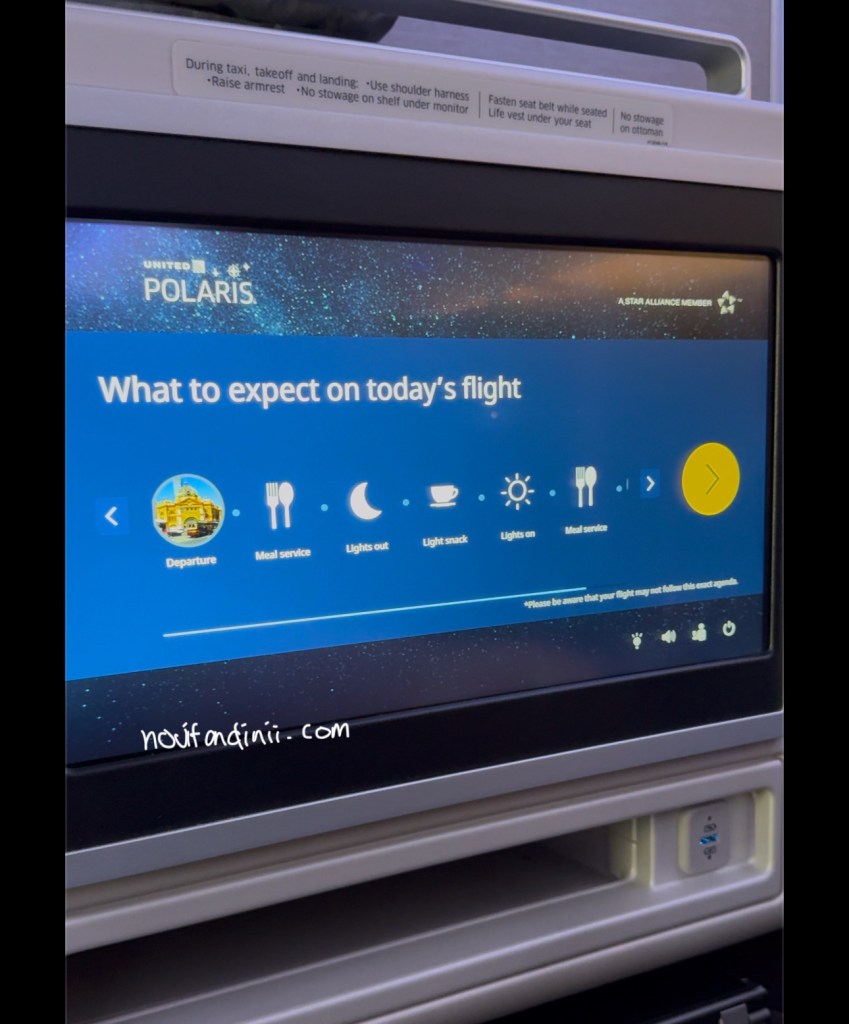 Hal yang lain yang aku sukai dengan United Polaris ini adalah kursinya yang lebih private/ tertutup. Aku sudah coba untuk mengintip tetangga di samping, tidak kelihatan kalau sedang duduk. Terdapat compartment atau tempat penyimpanan yang tertutup dengan pintu yang pas dibuka ada kacanya. Kita bisa menyimpan botol air minum, pouch toiletries, hp dan apa saja. Ada kacanya yang sangat berguna bagi kita kalalu mau touch-up dan bahkan melihat muka ini kalau ada keremus. Desain fitur area tempat duduknya juga terlihat bagus, simple dan masuk diakal. Tepat dibawah layar hiburan yang berukuran 16 inch, terdapat tempat untuk bisa menempatkan hp/ devices kita saat sedang di-charge. How cool is that. Fitur yang sederhana namun sangat bermanfaat sekali. Selain itu di bagian meja lipatnya, ada tempat sandaran ipad juga bagi kalian yang ingin nonton dari ipad atau hp kalian. Begitu juga dengan colokan headphone nya yang mudah untuk diakses. Satu hal yang kurang berkenan dihati, saat buka meja lipat di depan kita itu, agak susah untuk dibuka. Harus ditekan beberapa kali baru bisa terbuka dengan sempurna.