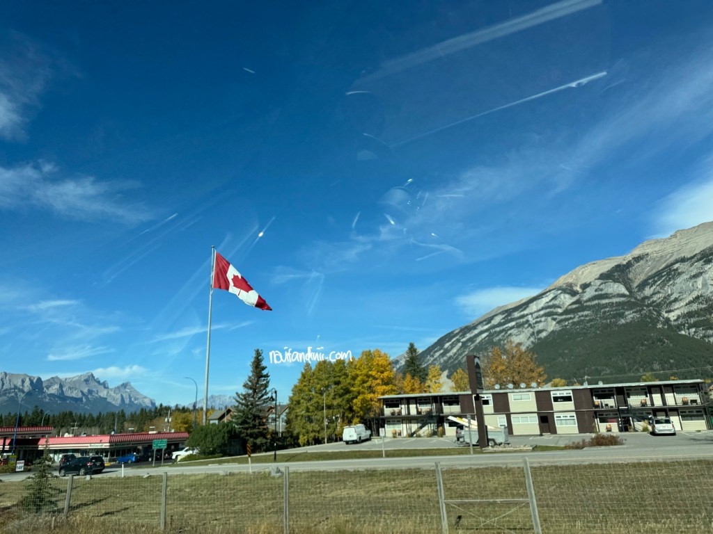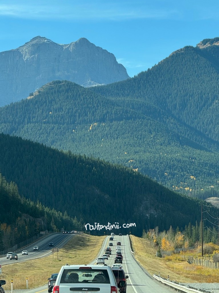 Berkendara dari Calgary ke tempat penginapan kita di kota kecil Banff membutuhkan waktu sekitar 1.5 jam atau 145km. Selama perjalanan saja, kita sudah sangat menikmati pemandangan hijau yang membuat mata melek di cuaca yang sangat bagus sekali/ hangat. Selain itu, jangan lupa perhatikan ‘speed limit’ kalau berkendara di highway disini yah, kebanyakan 90km per jam. Menyetir memang pilihan yang praktis bagi kita yang hanya 3 hari saja 2 malam saja di Pegunungan Rocky Kanada dini. Karena memang, masih terbatas transportasi publiknya menjangkau berbagai titik spot turis, mengingat ini area nya cukup luas dan masih alamiah.
