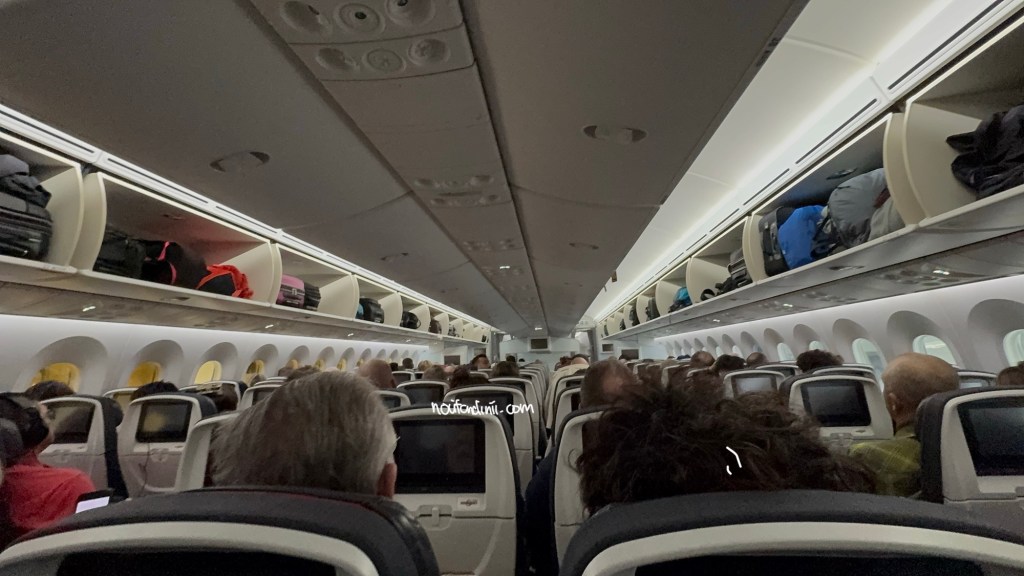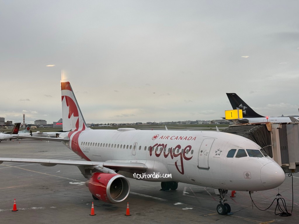 Ada beberapa cara untuk ke Taman Nasional Banff. Bandara Calgary adalah bandara terdekat dari Banff, sekitar 130 km timur dari Banff. Itu kenapa kita masuknya lewat kota Calgary, dengan menggunakan pesawat dari Quebec city yang transit di Montreal (pusat industri kreatif dan teknologi nya Kanada). Karena memang terbatas sekali penerbangan langsung dari Quebec city dan kebanyanya akan transit minimal di satu kota seperti Montreal. Jangan seperti kita yah yang mau beli tiket last minute, harganya jadi mahal tidak pakai nalar. Akhirnya kita putuskan pakai point frequent flyer untuk penerbangan dengan Air Canada. Itupun gaya banget kita ambil kelas bisnis dari Quebec ke Montreal, karena hanya ini saja yang tersedia untuk beli pakai point. Kita tukar 18k point dan bayar saja yang biaya pajaknya sekitar 370k Rupiah per orang untuk penerbangan kurang dari sejam. Lalu sambung lagi dari Montreal ke Calgary selama 4.5jam dengan harga tiket sekitar 2.4 juta Rupiah per orang, kelas ekonomi. Harga kelas ekonomi ini hanya termasuk tas kabin 7kg dan satu barang bawaan personel/ tas tangan yang muat dibawah kursi didepan kita yah. Pesawatnya ini yang besar boeing 787-9 dengan layout kursi 3-3-3. Kita dapat barisan tengah namun untungnya tidak ada orang yang duduk di kursi diantara kita. Hore, bisa lebih leluasa selama 4.5 jam kedepan. Kita sempat dapat sekali snack?, ada colokan listrik, charger usb dan kursinya juga bolehlah.