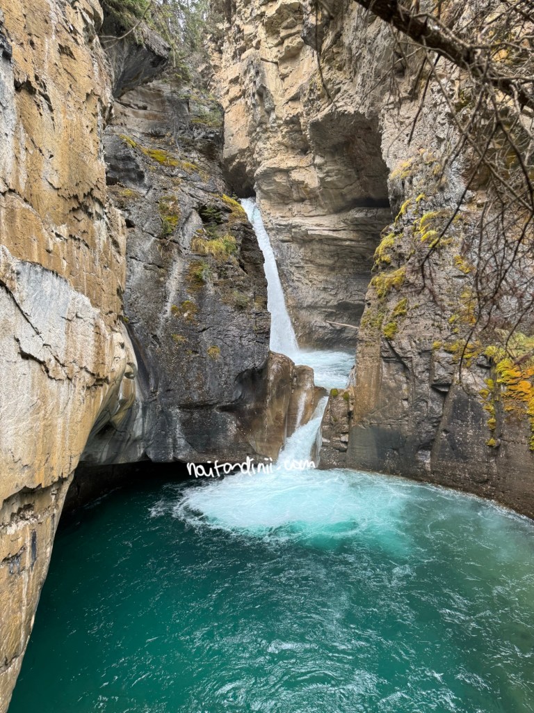 Setelah urusan pencucian baju beres, kita balik hotel untuk check-out. Selanjutnya, kita lanjut perjalanan lagi ke penginapan kita berikutnya yang butuh waktu sekitar 50 menit (63km). Dalam perjalanan, kita berhenti di Johnston Canyon, setelah 32 menit berkendara dari hotel. Tempat ini terkenal dengan jalur pendakiannya yang indah. Johnston Canyon ini terbentuk dari erosi air yang mengalir melalui batu kapur selama lebih dari ribuan tahun dan membentuk formasi bebatuan yang unik dan curam. Katanya tempat ini merupakan salah satu yang populer. Jadi jangan heran, kalau parkiran cepat penuh dan banyak orang disini.