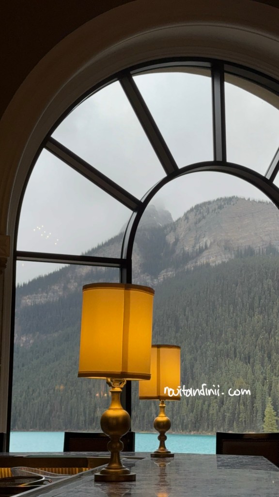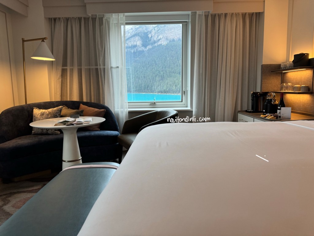 Aku bisa bilang, dari semua hotel di trip US Kanada kita di tahun 2024 ini, hotel Fairmont Lake Louis ini yang terbaik. Resepsionisnya baik banget, ramah, profesional, dan menjelaskan semua hal yang kita butuhkan. Kita diberikan upgrade kamar dengan pemandangan lake Louise yang sangat memukau dan kamar yang sudah direnovasi dengan style yang lebih moderen. Karena memang, ada kamar juga yang belum direnovasi, masih bergaya klasik. Selain itu, karena kita sempat mengatakan kalau ini merupakan trip ‘wedding anniversary’ kita yang ke 4 tahun dan memang benar, kita dapat dapat gratis voucher naik ‘canoe’ gratis untuk sejam (nilainya CAD$165/ 1.8juta IDR). Bahagia banget, bisa naik canoe di lake Louise, yang sudah lama menjadi bucket list ku.