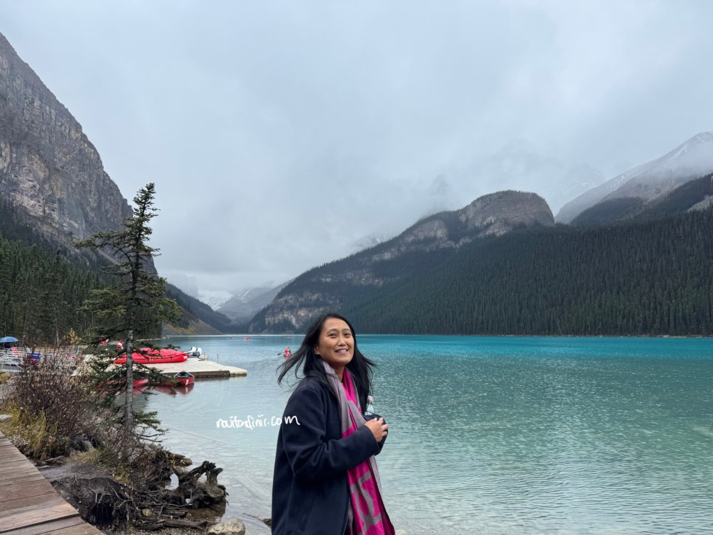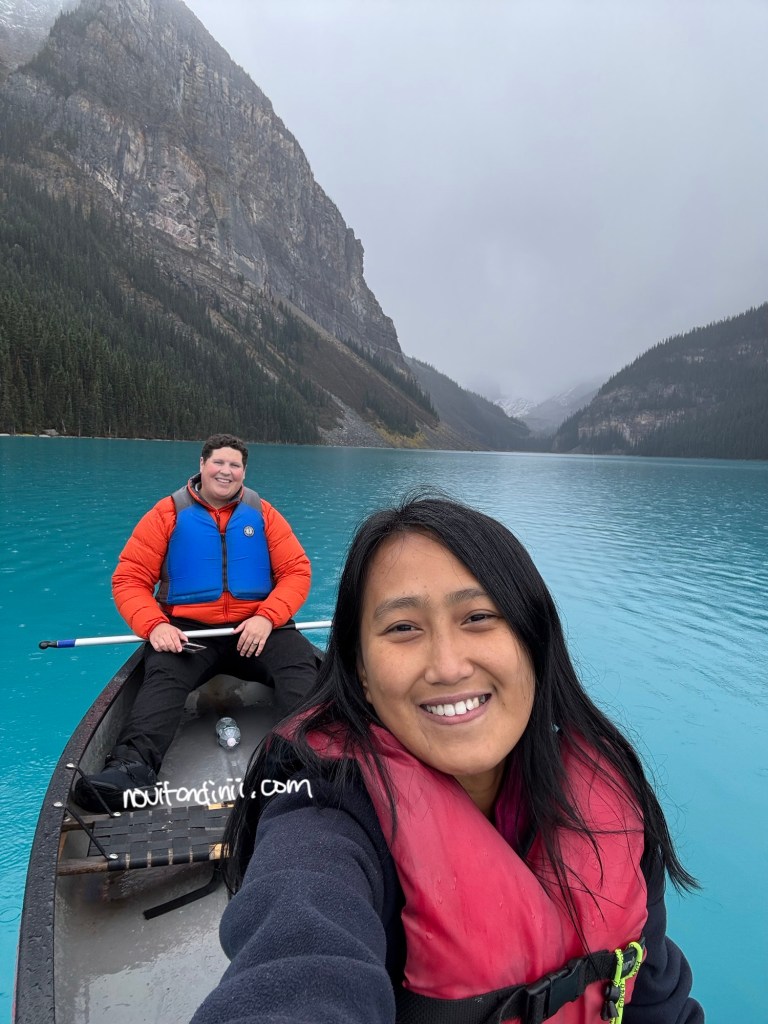 Sebelum check-out hotel, kita sempetin main canoe dulu dengan menukarkan voucher yang diberikan resepsionis saat check-in. Mungkin karena gerimis, saat itu tidak ada yang mengantri. Kalaupun sedang ramai, canoe ini memiliki dua antrian yaitu untuk tamu hotel dan untuk umum. Karena memang canoe satu-satunya yang ada di Lake Louise dioperasikan oleh hotel Fairmont Lake Louise ini. Harga canoe untuk umum yaitu CAD $165 (1.8 juta Rupiah) per canoe per jam. Sedangkan untuk tamu hotel yaitu CAD $105 (1.1 juta Rupiah) per canoe per orang. Seperti biasa, sama seperti di USA, harga yang tertera belum termasuk pajak yah. Untuk satu canoe, bisa muat sampai 3 orang. Bahkan tidak ada batas berat badan, bisa dibayangkan kualitas canoe nya yah. Selama ini, kita kalau naik canoe, biasa aku tanpa suami, karena ada batas berat badan per orang. Jadi kali ini, bisa barengan suami deh main canoe dan ada foto berdua sebagai kenang-kenangan. Ini baru namanya berkah ‘anniversary’.