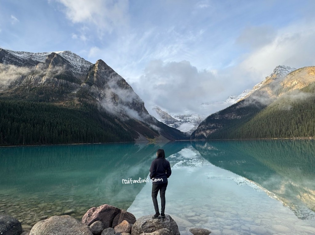 Masih pagi suasananya masih tenang dan nyaman. Namun menjelang siang, area disekitar danau ini menjadi lebih ramai. Terlihat ada beberapa bus membawa wisatawan. Disekitar danau juga terdapat hutan hijau dan padang rumput yang dihuni berbagai satwa liar seperti beruang dan rusa. Sebenarnya ada banyak jalur hiking disekitaran danau ini yang menawarkan pemandangan yang luar biasa. Namun ada beberapa jalur hiking terkenal seperti Lake Louise Lakeshore Trail, mount Fairview, Beehive trail, dan sebagainya. Lake Louise Lakeshore trail ini jalur yang sangat mudah diakses dengan mengikuti jalur sepanjang tepi Lake Louise. Sebenarnya kita pengen ikutin jalur ini, namun karena sempat gerimis jadinya kita mager deh.